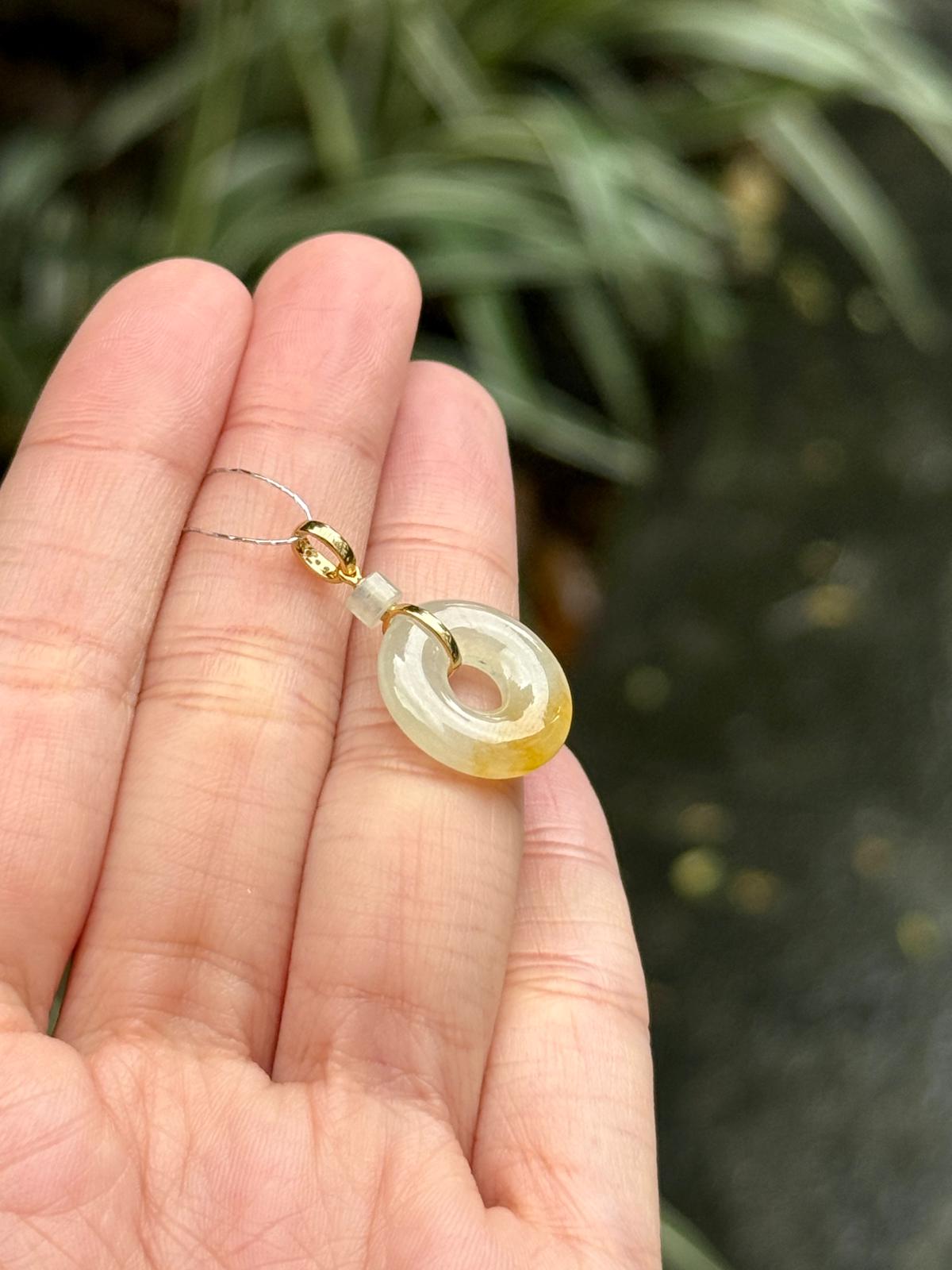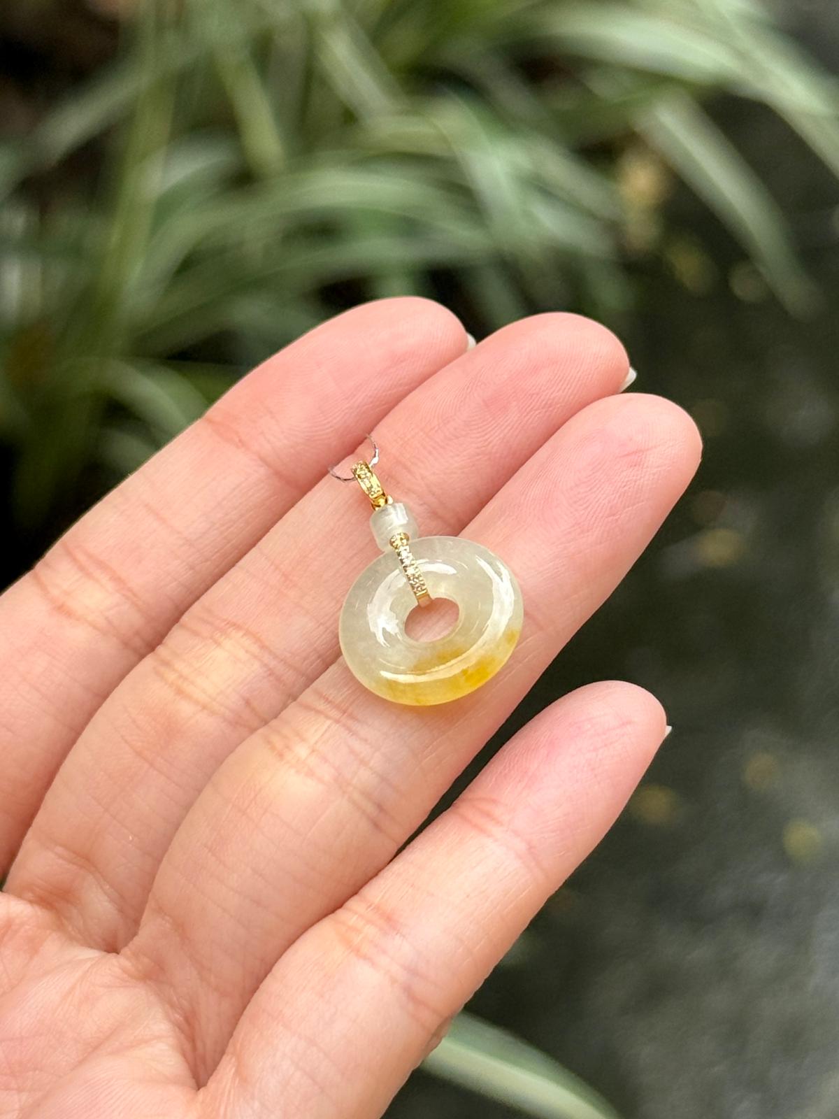 Our best selling jadeite donut pendant design. This piece is from another batch of jadeite slab that has very good translucency, water and a very cheerful colouration. Naturally occurring in near colorless base, lightly dipped in light lemonade yellow. This piece was carved into a hoop / petite donut pendant.
