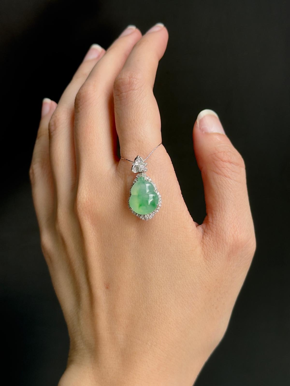 A premium quality Hu Lu pendant with silky sunny green streaks beautifully painted on a clean icy colourless base. This intricate pendant features incredible icyness with refined jelly-liked texture and very good translucency. In a classic and timeless solid 18K white gold setting with natural diamonds, an investment collector perfect for daily wear.