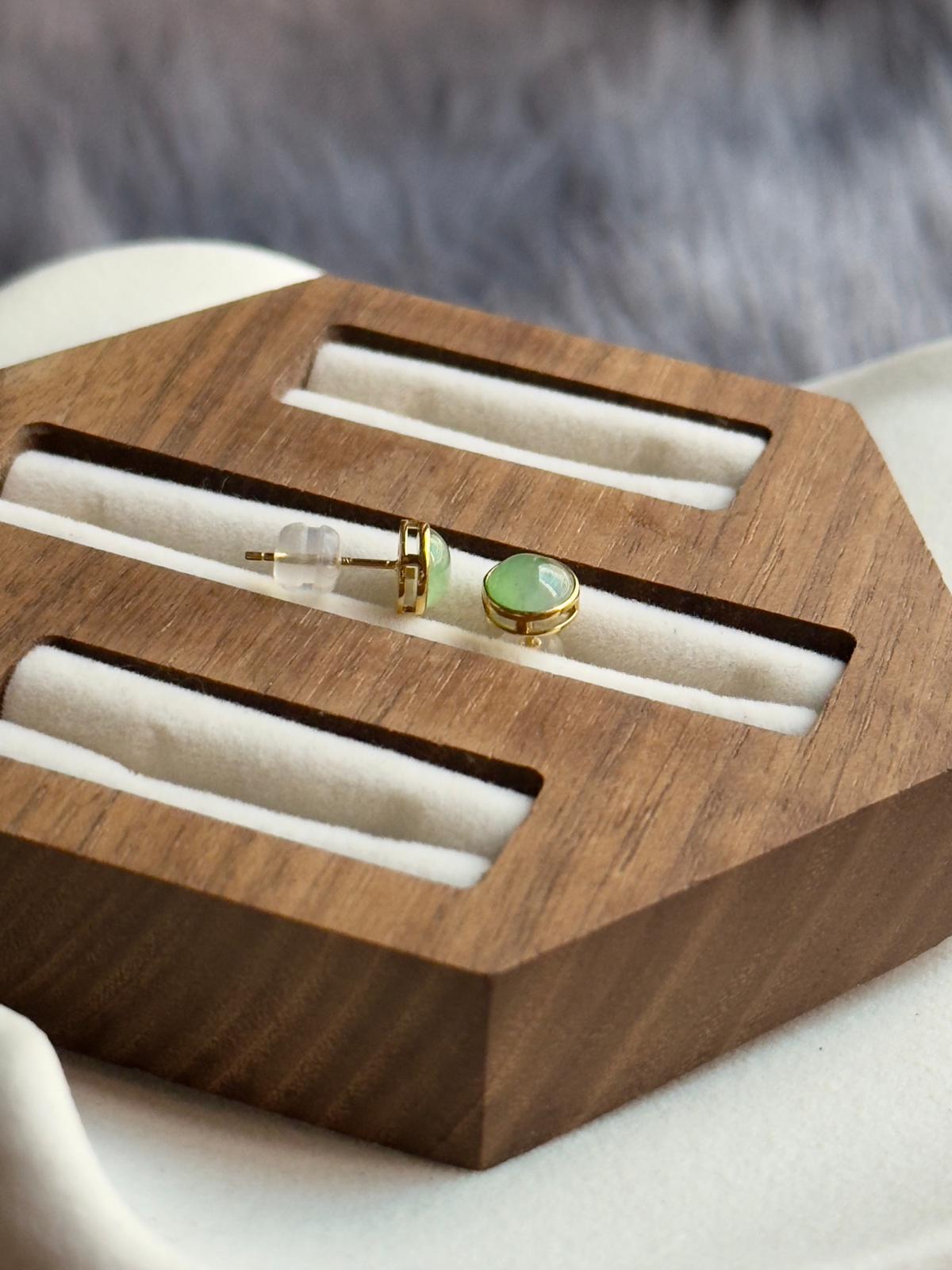 Burmese silky sunny green jadeite in rounded cabochon cut. This shade of light green is pair with streaks of sunny green within the cabochon making it a highly sought after combination. With very good icyness and thickness, the studs appear more substantial in real life! Considering today’s gold rates, this pair offers exceptional value without compromise.
