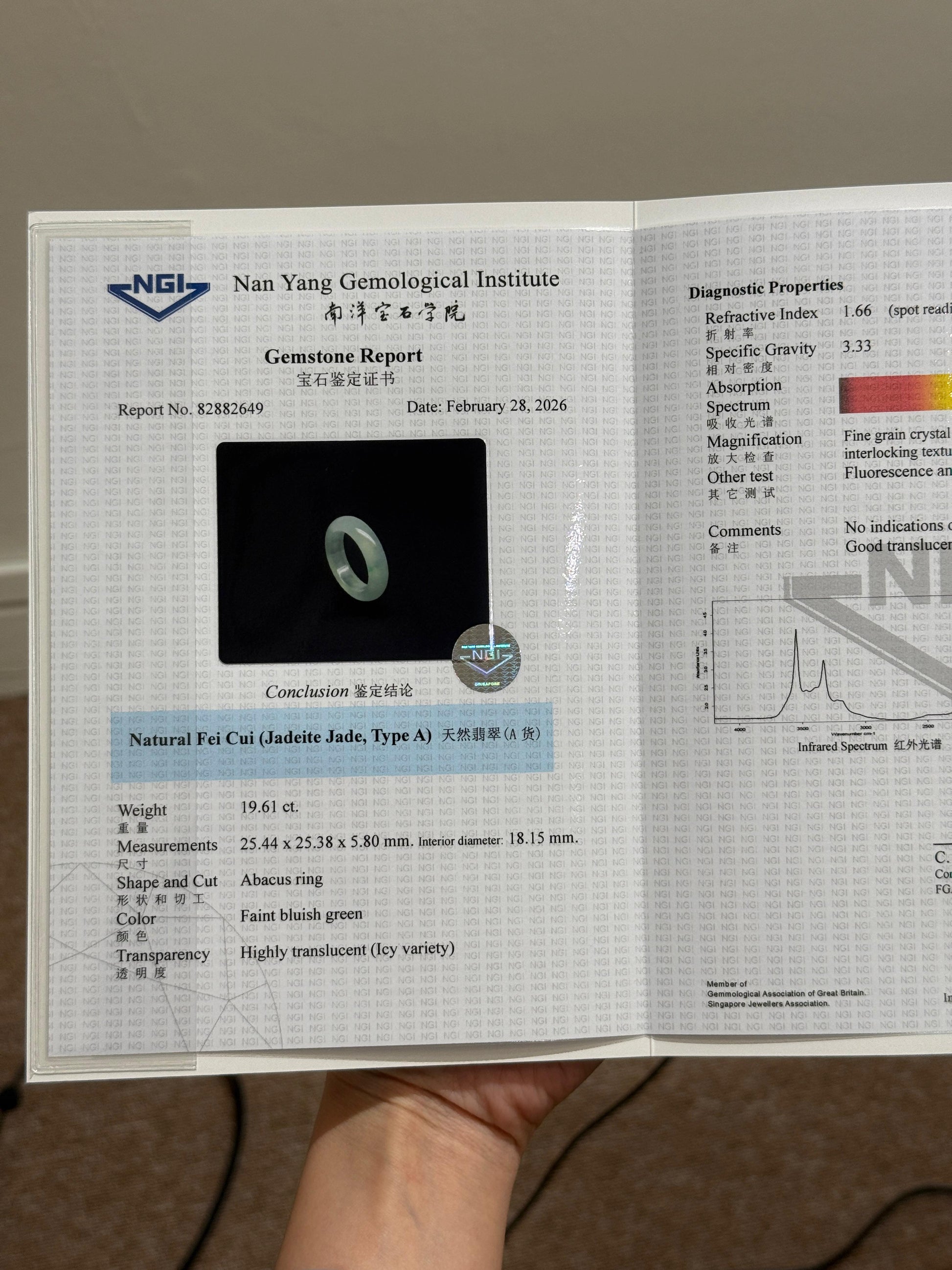 This icy variety light bluish green abacus ring carries the kind of translucency that reveals itself differently in every light. Refined grains, even water, and a generous cut above 3mm place this at a rare intersection — collector-grade translucency in a piece thick enough for everyday confidence. From a slab with exceptional water and consistency throughout, just look at the waterhead bursting through our phone lens.