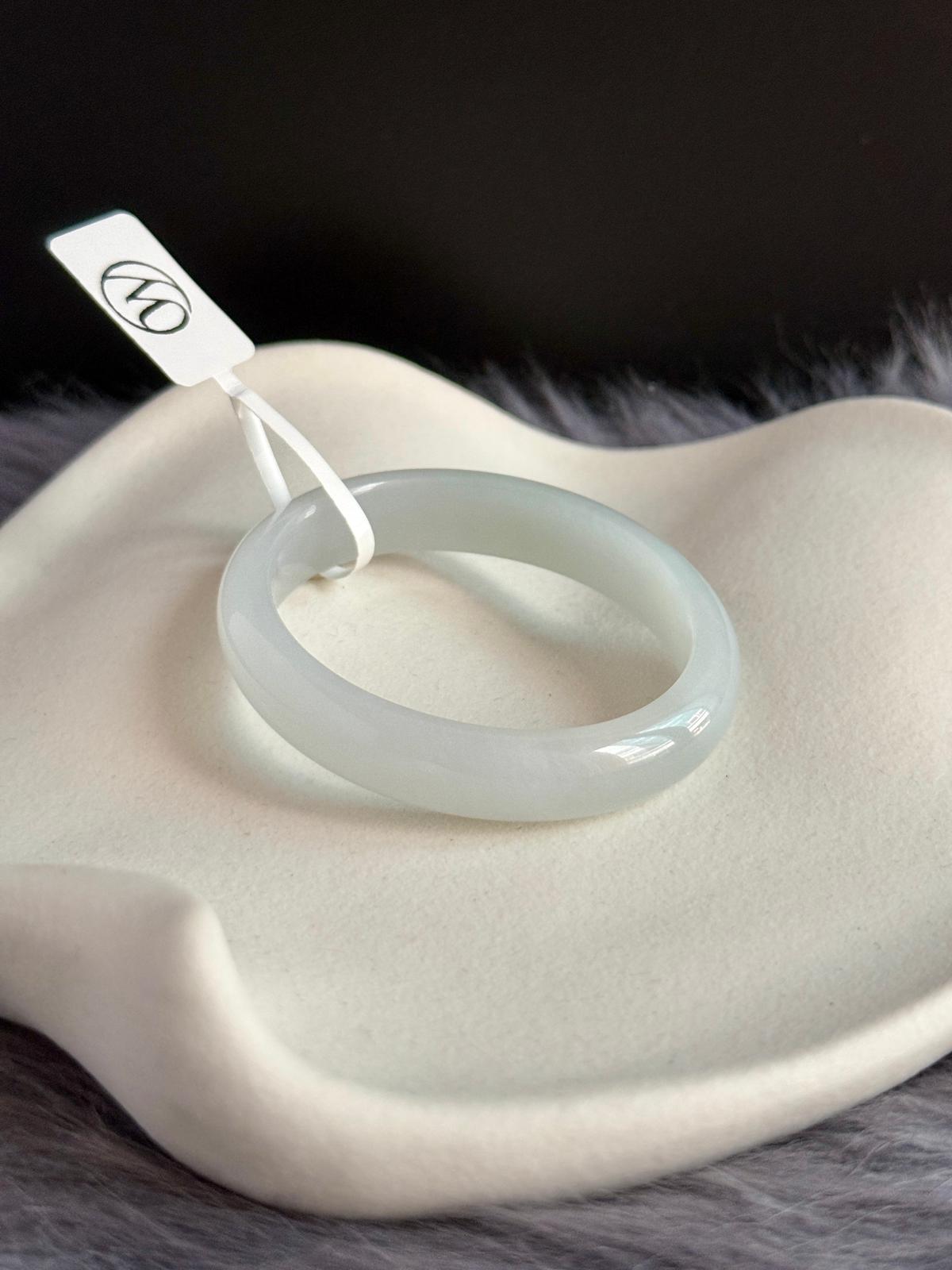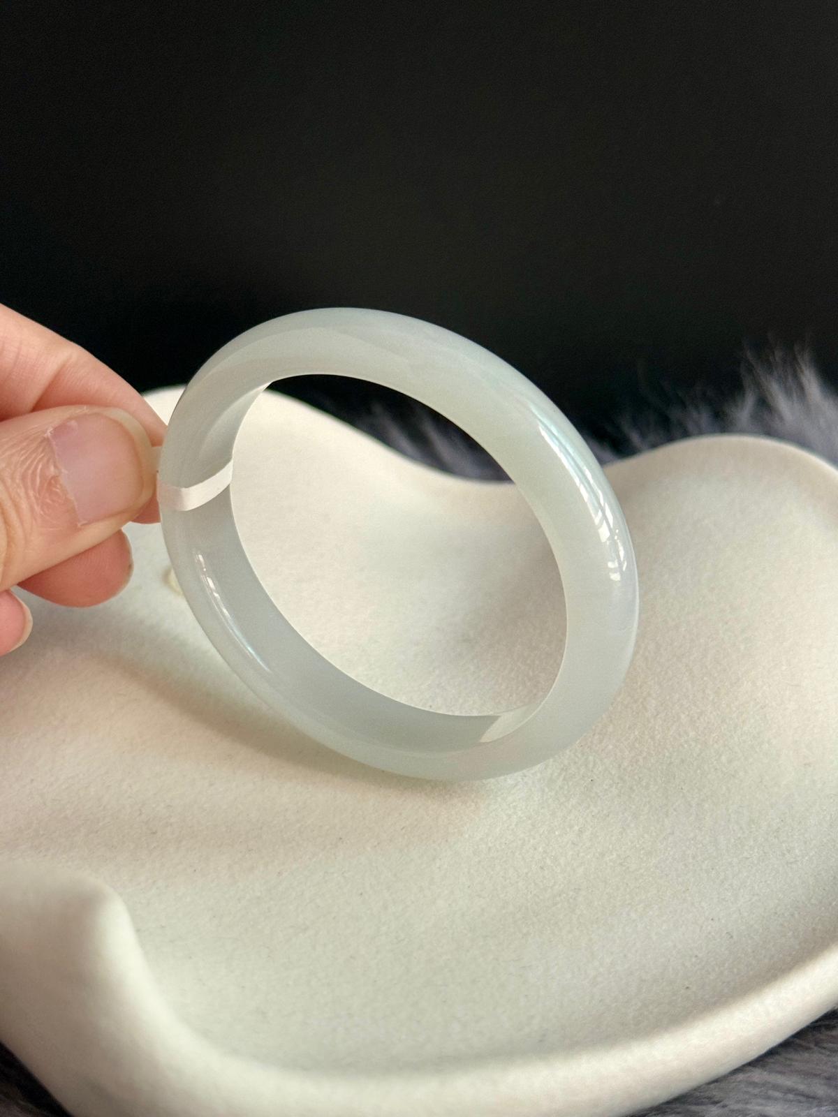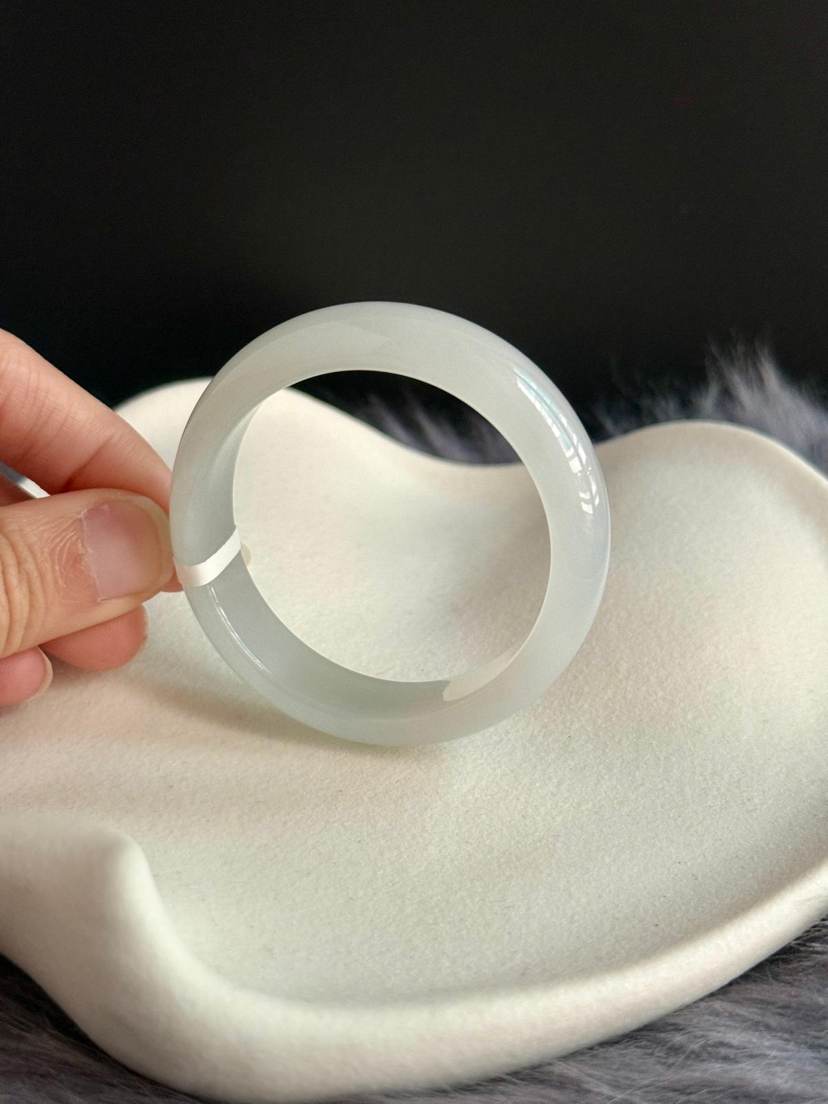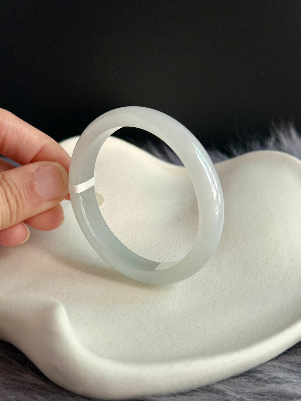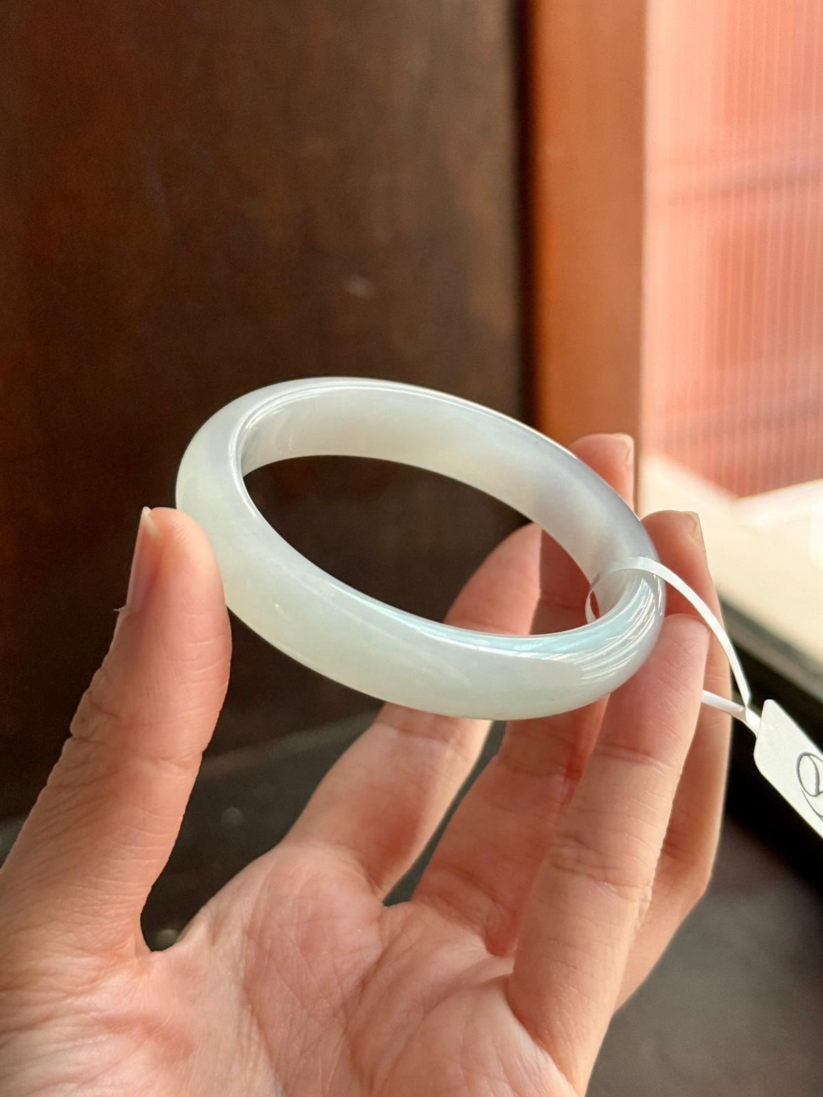 Translucent. A beautifully translucent mild icy-glutinous jadeite bangle with a smooth and jelly-like inner texture. It is a piece with really good wateriness and hints of faint green when its indoors. Under the sun, this piece appears more colourless -- an unique characteristic of jadeite stones.