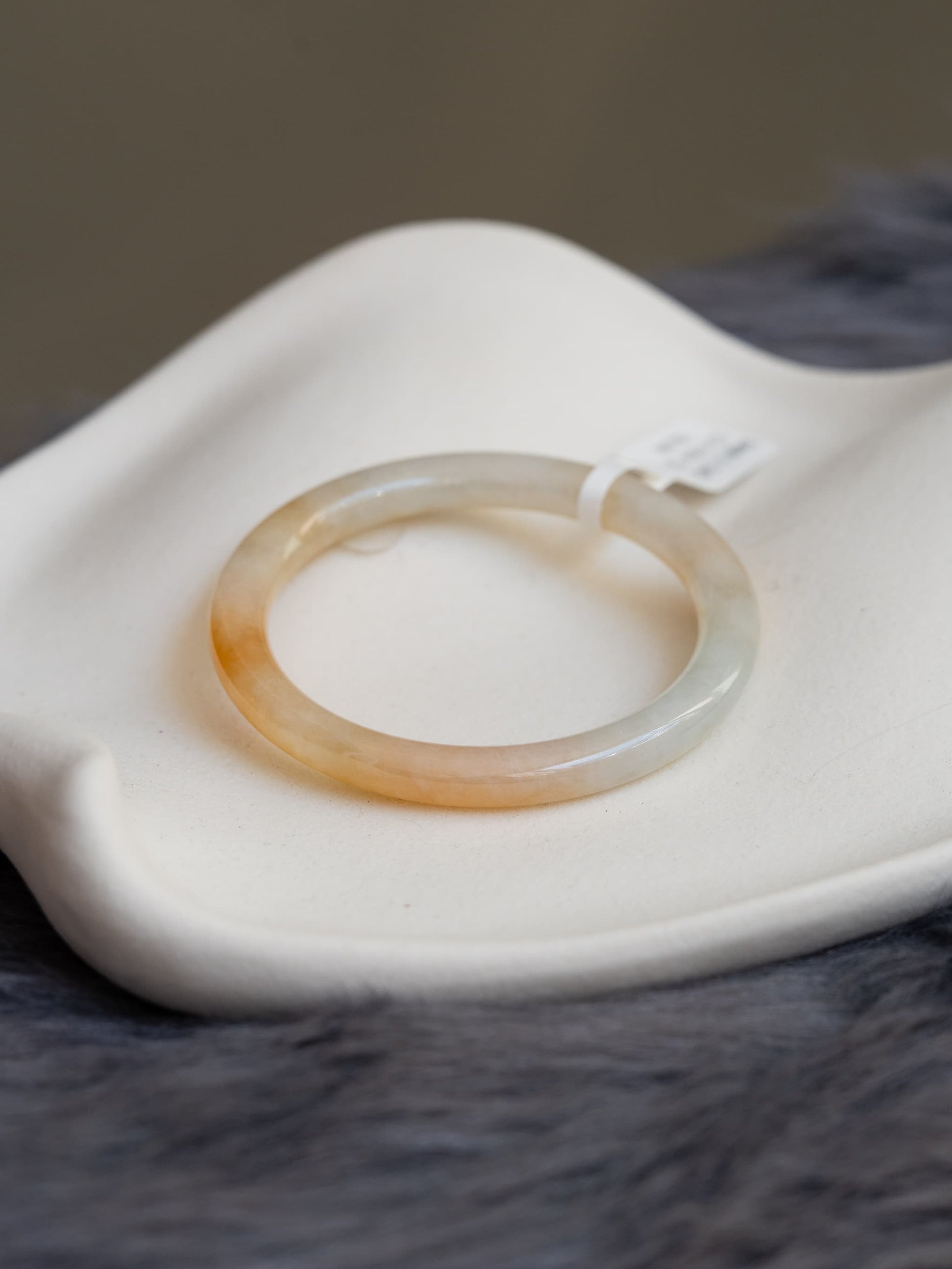 A vivid yet refined yellow, beautifully set against a clean white base — a true creation of nature. This slim bangle is exceptionally rare, featuring an icy-glutinous texture with superb wateriness and even colour tone throughout. The yellow hue passes seamlessly through the entire band, showing no patchiness. Flawless, with no internal lines, cotton clouds, or cracks — a radiant piece of quiet luxury.