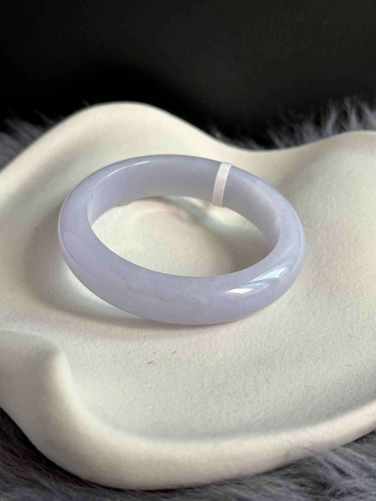 Translucent. In a light and vibrant shade of lilac lavender, this is an icy-glutinous piece that boast of good water and very even colouration throughout the jadeite stone. This piece has refined grains for lilac lavender and it's very clean without any specks of wuji or red. Perfect for ladies looking for a spotless bangle. It is a line-free piece, without any internal lines. A flawless, premium cut and finely textured lavender bangle like this is hardly found below $6000 in the market.