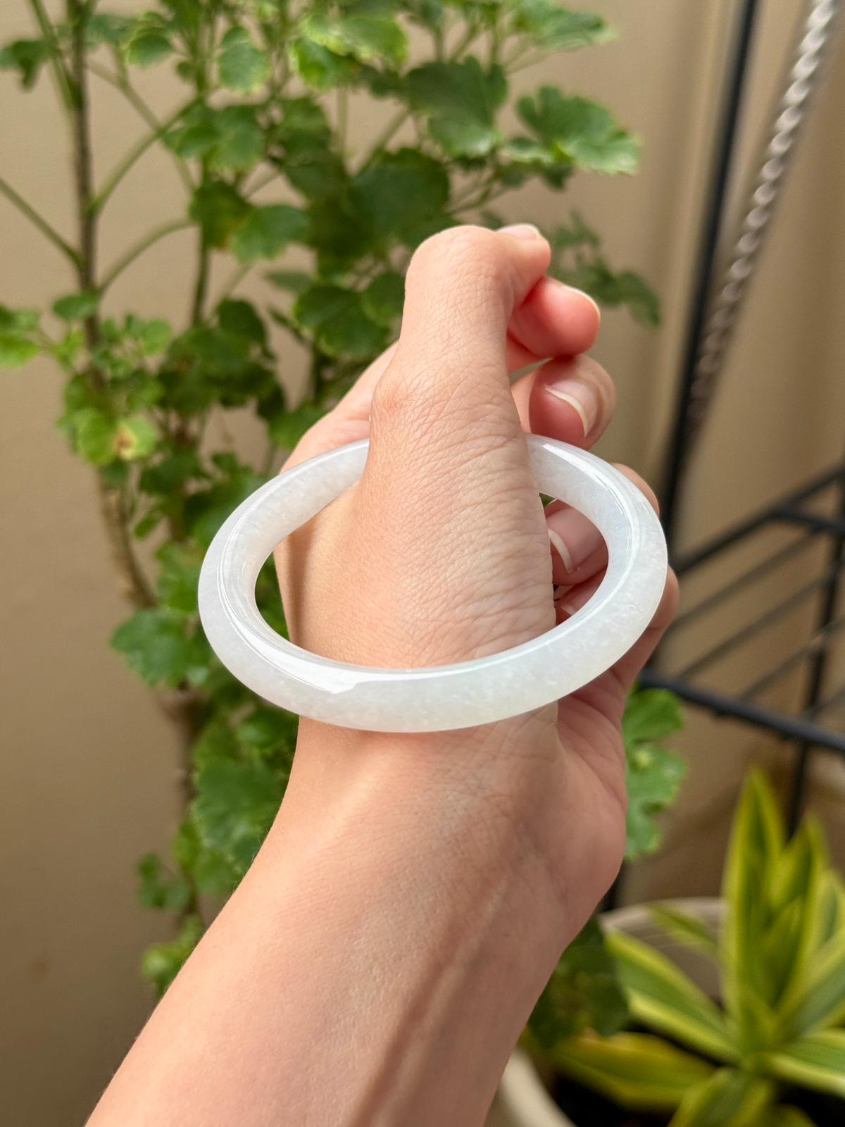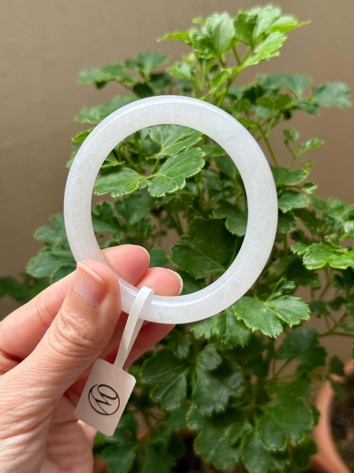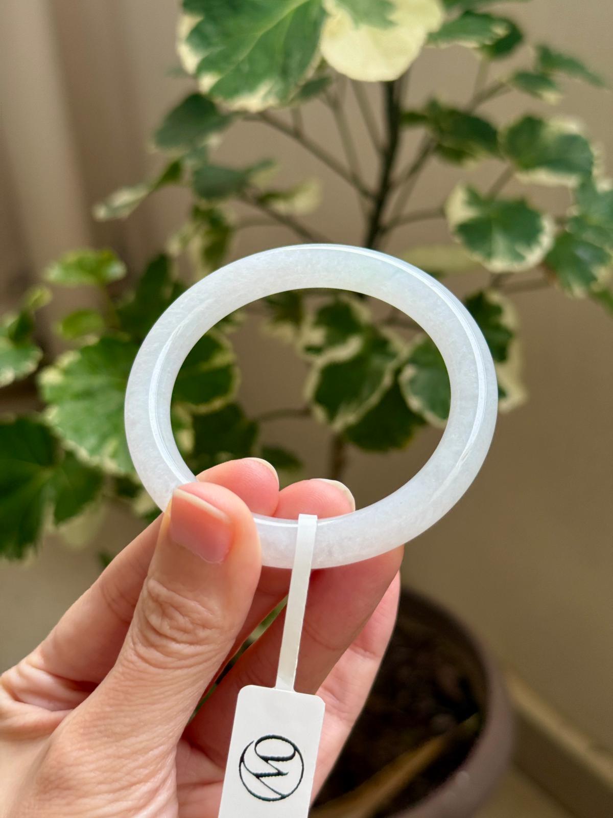 An icy clean white jadeite with good wateriness, good translucency and refined grains. Flawless in quality, it is free from heavy cotton patches on the surface, dirt patches, stone-lines, veins, or cracks. A perfect starter or everyday bangle in a substantial yet everyday cut for a small wrist size 52. A clean and icy white piece is a staple in every wardrobe that withstand the test of time.