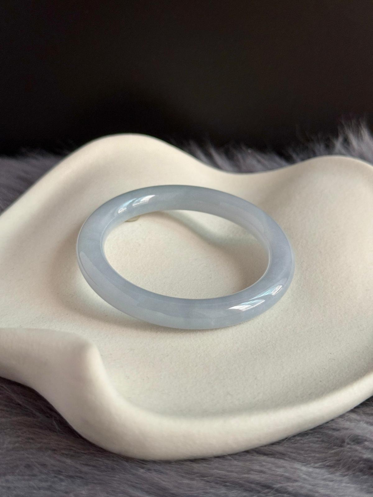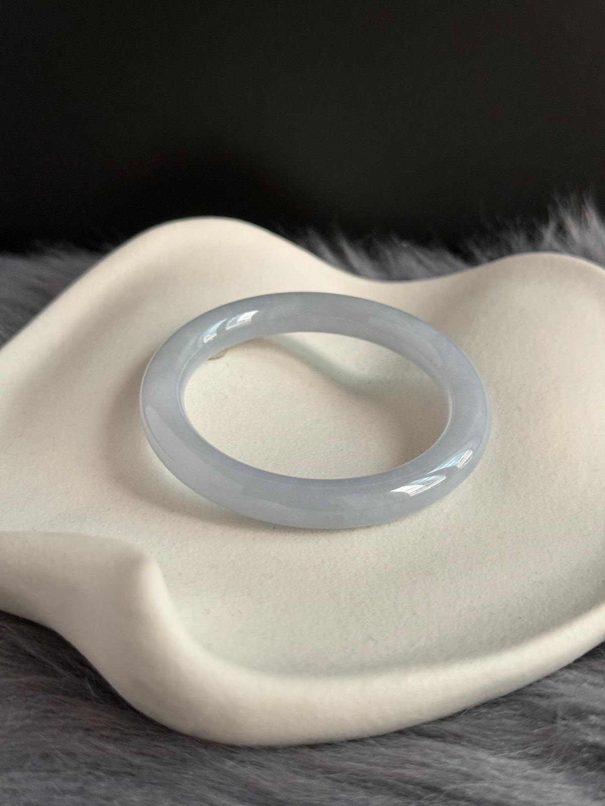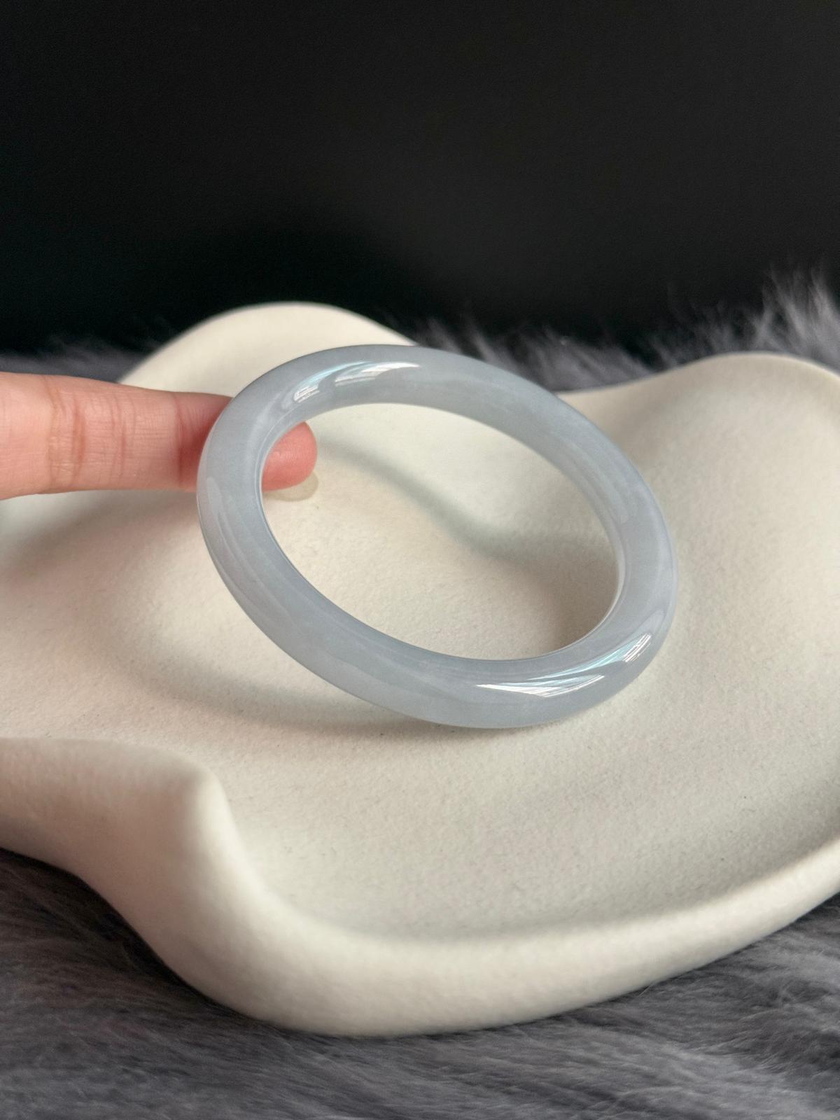 This piece is a vibrant light sky blue jadeite with refined grains that are almost visually poreless when torched through. It has a very smooth surface sheen with very good wateriness. It is flawless in quality, free from dry dirty patches, cotton patches, stone-lines, veins, or cracks. A rare find for the keen-eyed jadeite collector.