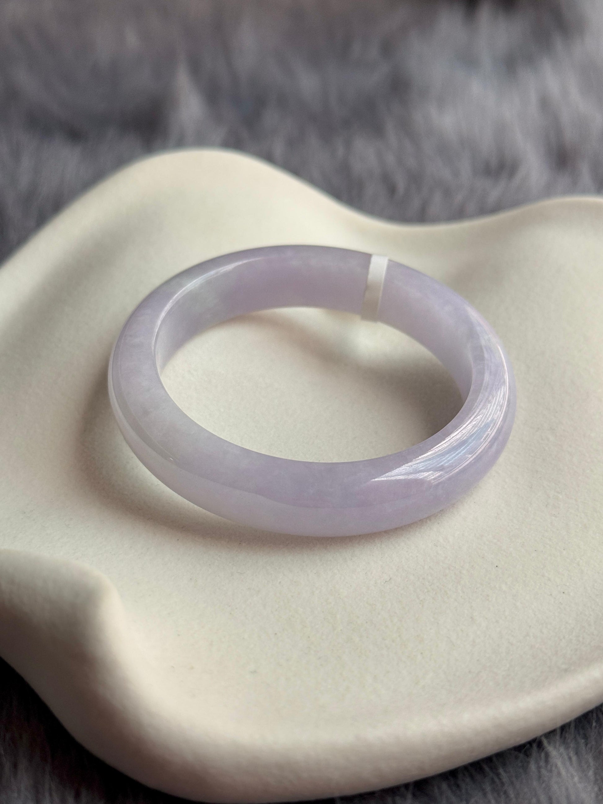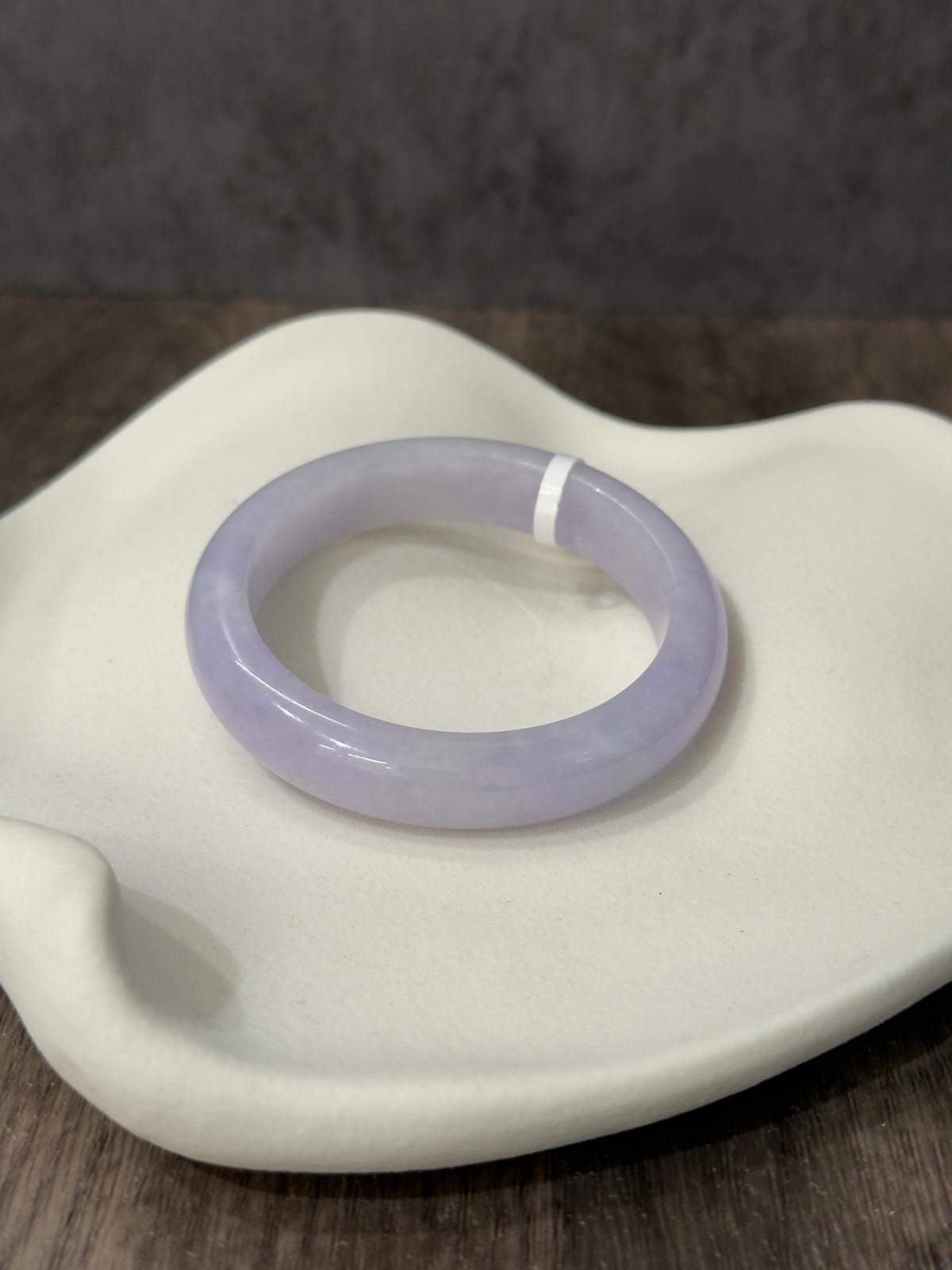 This piece features a gently icy lilac lavender with refined grains, smooth sheen and wateriness is very good. It is flawless in quality, it is free from heavy cotton patches on the surface, dry dirty patches, stone-lines, veins, or cracks, making it a perfect full lavender bangle.