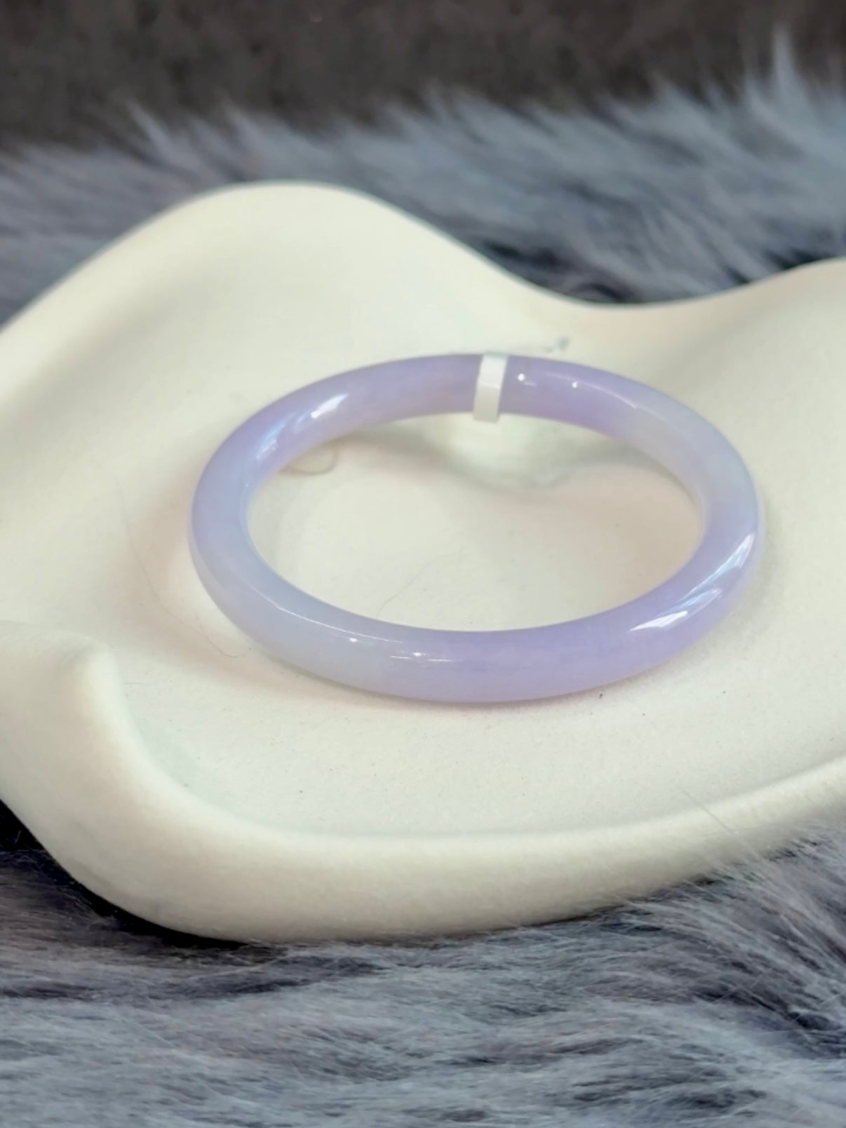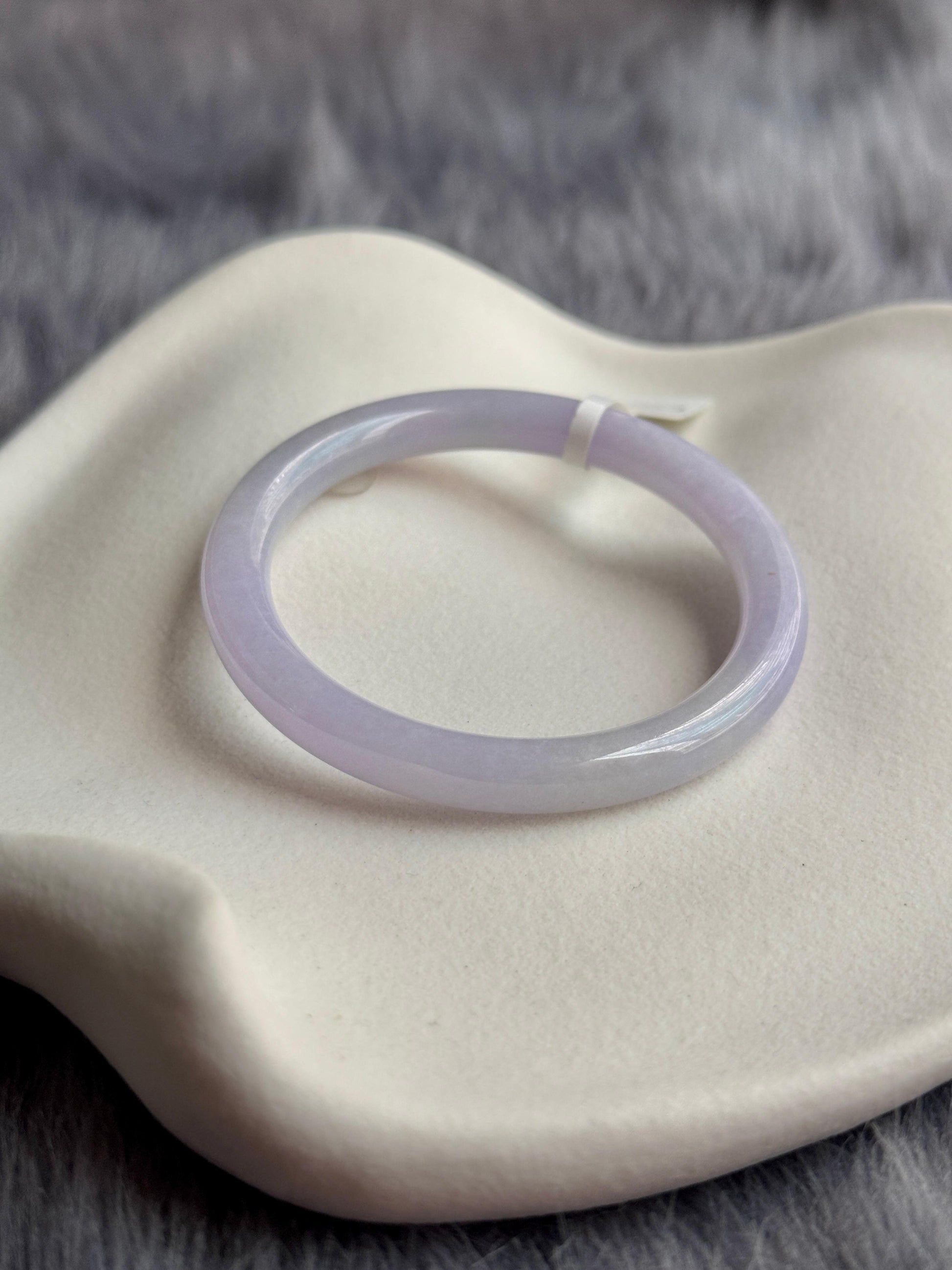 This piece features a vibrant red-hued lavender (prized for its red-hued lavender tones) in a slimmer cut of 7.6mm. It has a remarkably refined grains, smooth sheen and wateriness is very good. It is flawless in quality, it is free from heavy cotton patches on the surface, dry dirty patches, stone-lines, veins, or cracks, making it a perfect full lavender bangle.