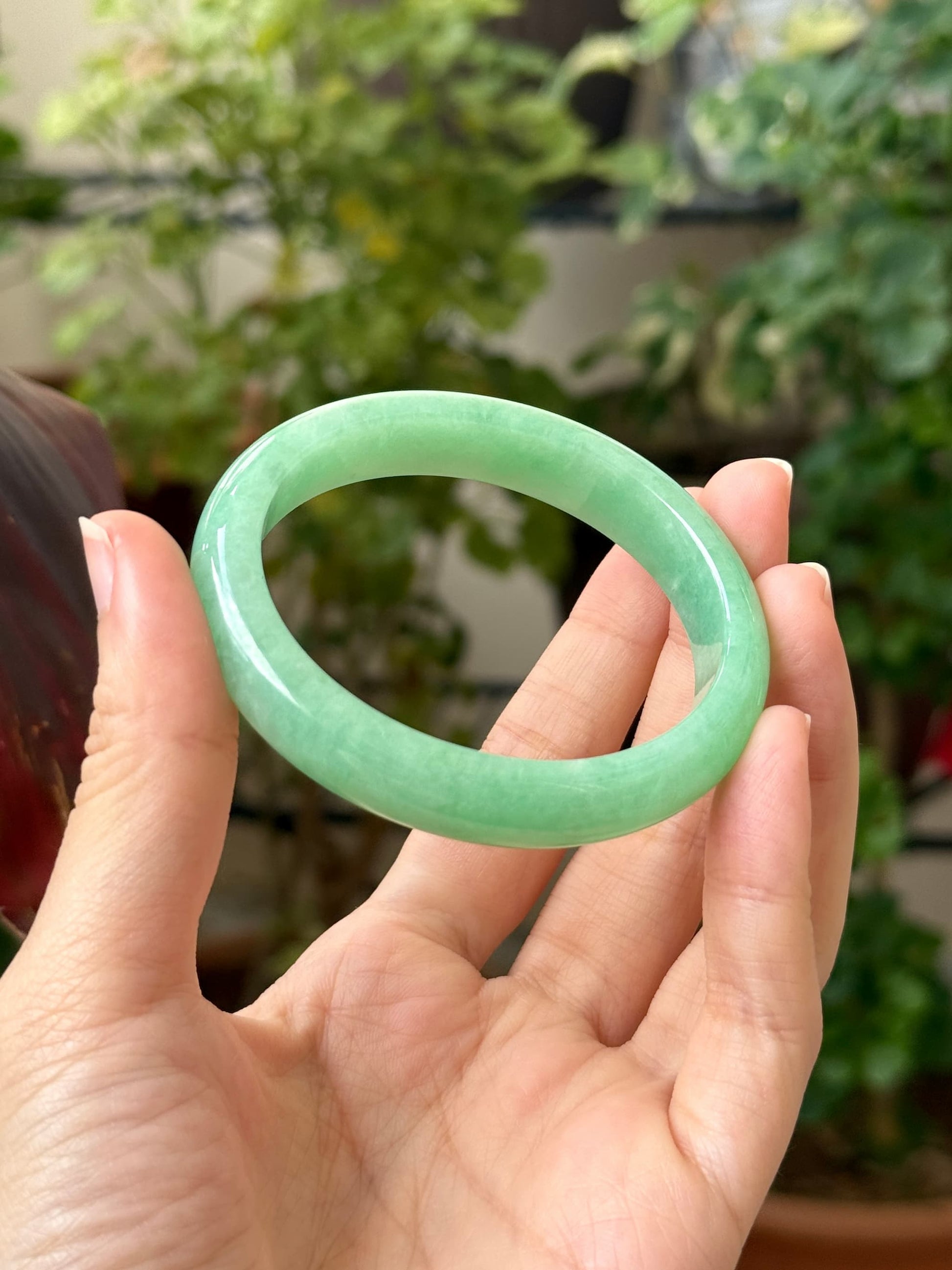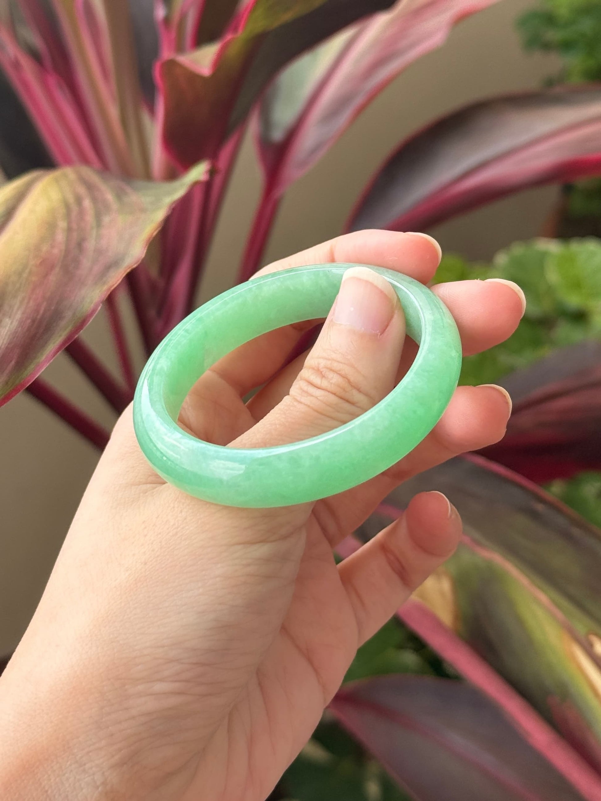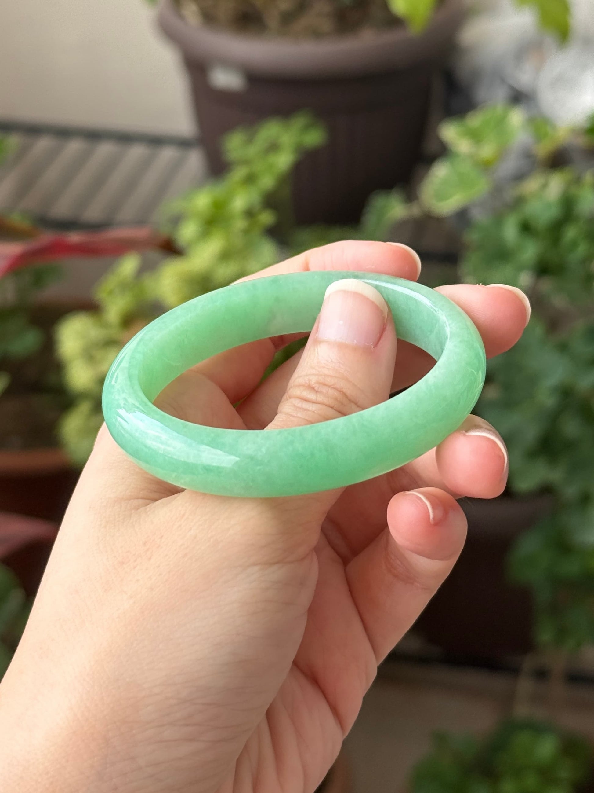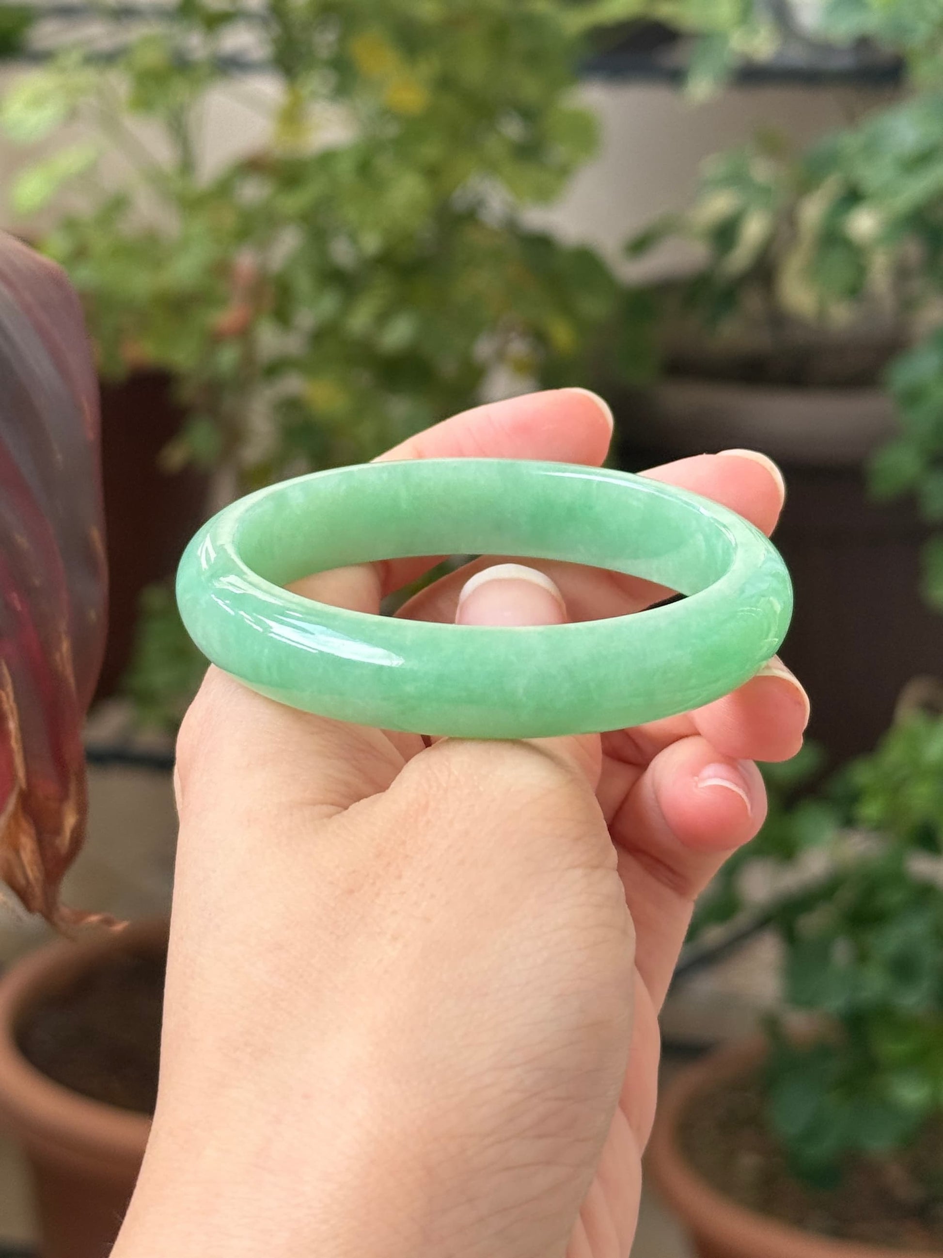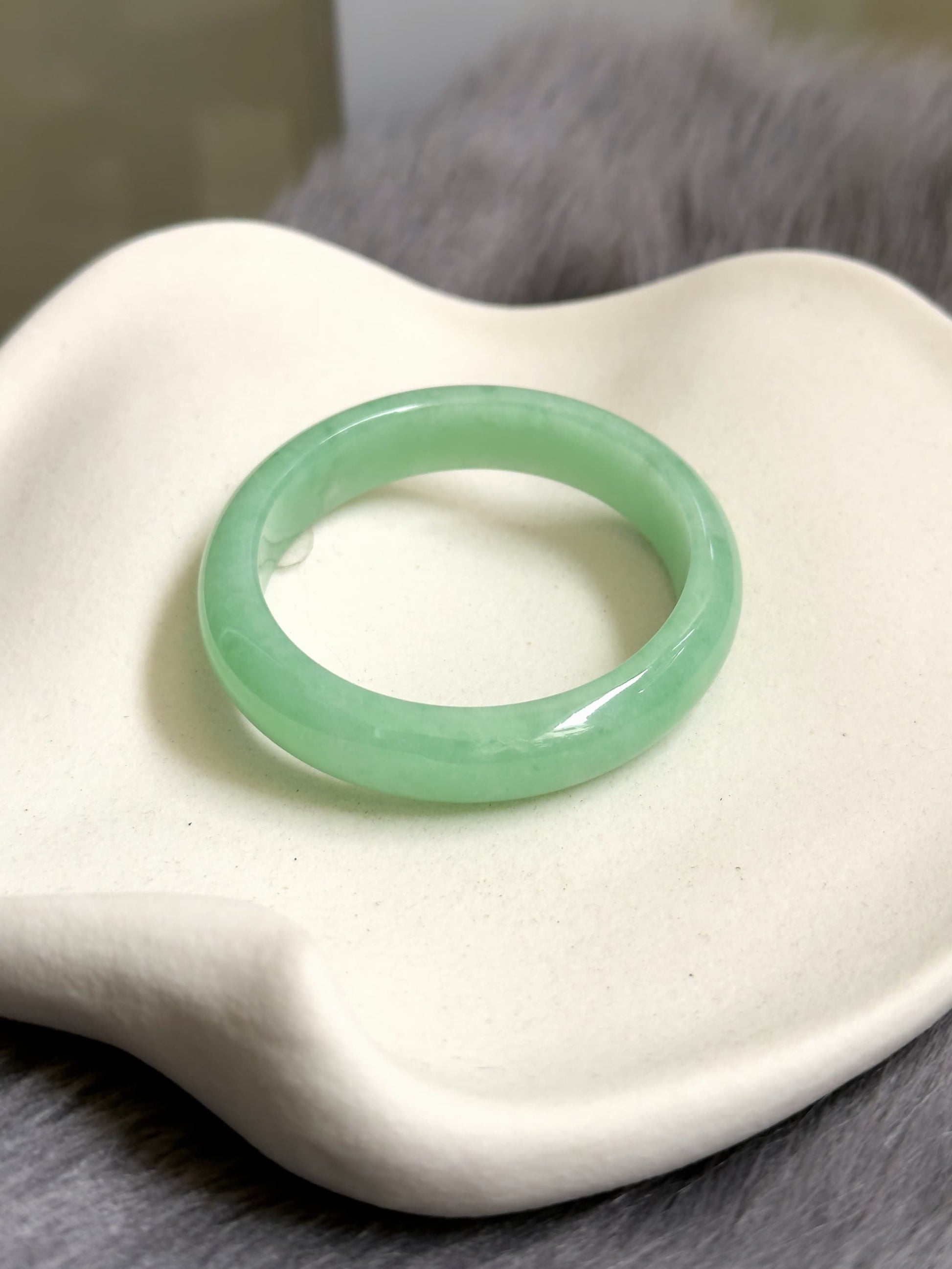 This piece features a vibrant sunny apple green with really refined grains, very good wateriness and flawless condition. This piece is rare because vibrant green jadeites are usually littered with internal lines. When viewed against sunlight, this piece is remarkably green. This piece is free from any cotton patches on the surface, any dry dirty patches, or cracks, making it a perfect collector's green piece.