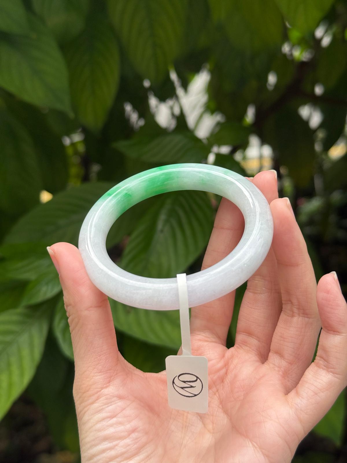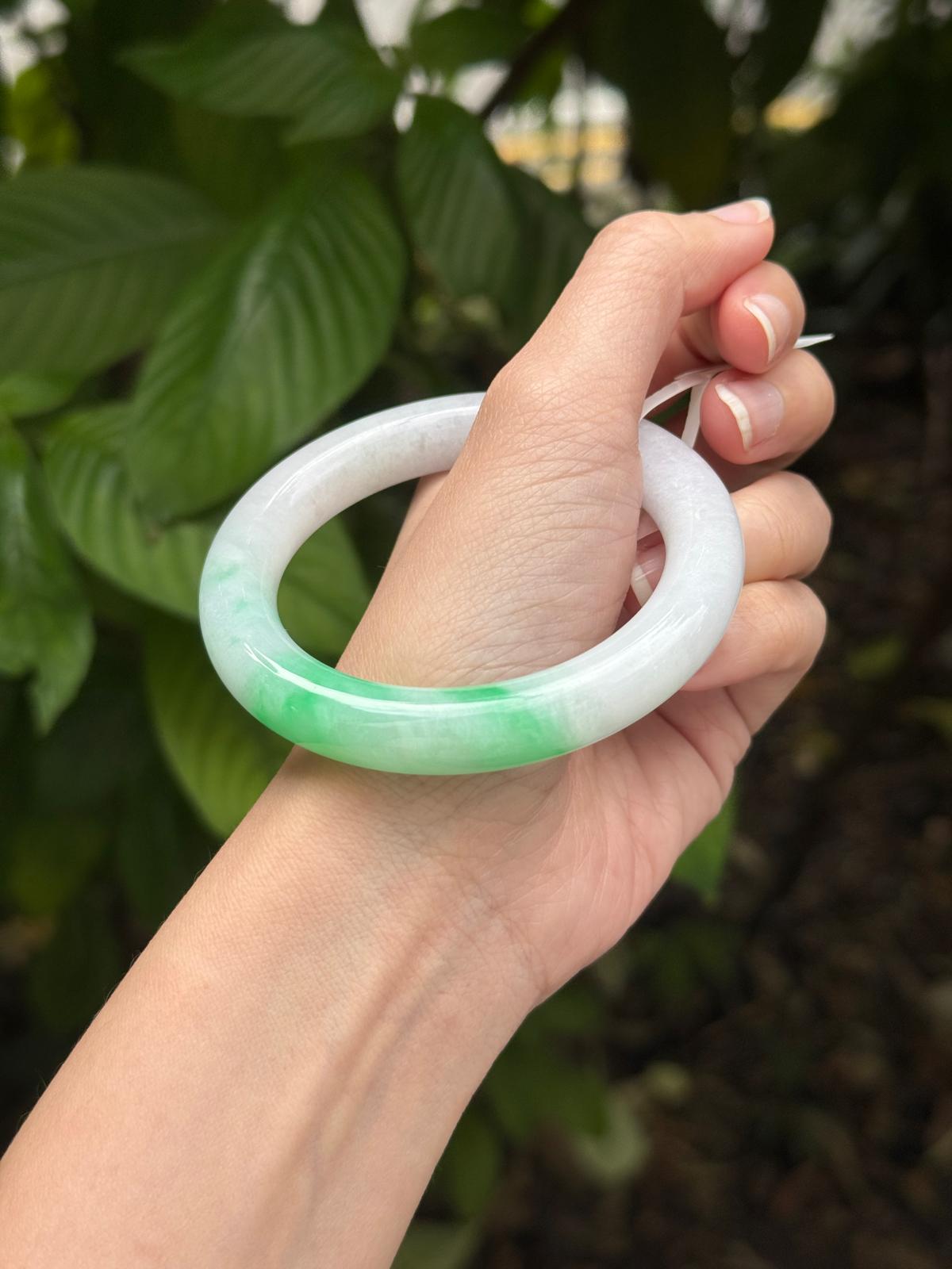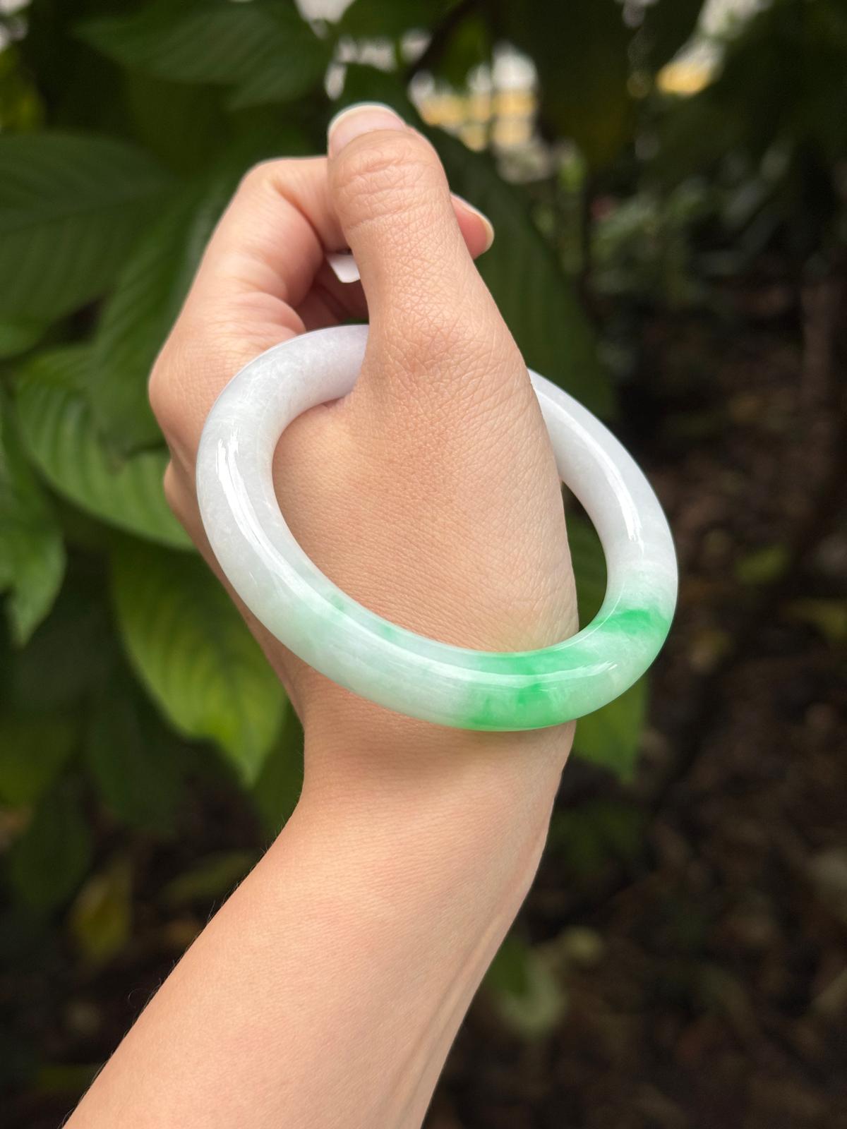 This rare thick-cut jadeite bangle features a stunning moss-on-snow effect, with vibrant sunny green on a clean white base. Crafted with very fine grains for this lively hue, it boasts a glutinous, mildly icy translucency that enhances its brilliance. Prized for its color vibrancy and premium cutting, this is free from cotton clouds or any dirt patches, making it an exceptional find.