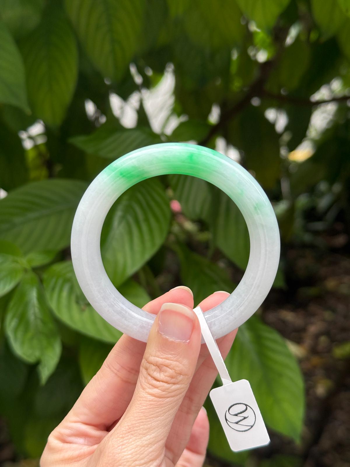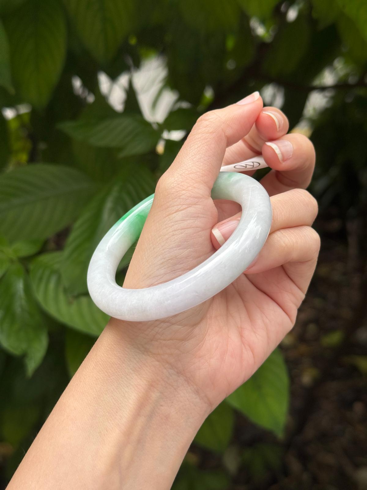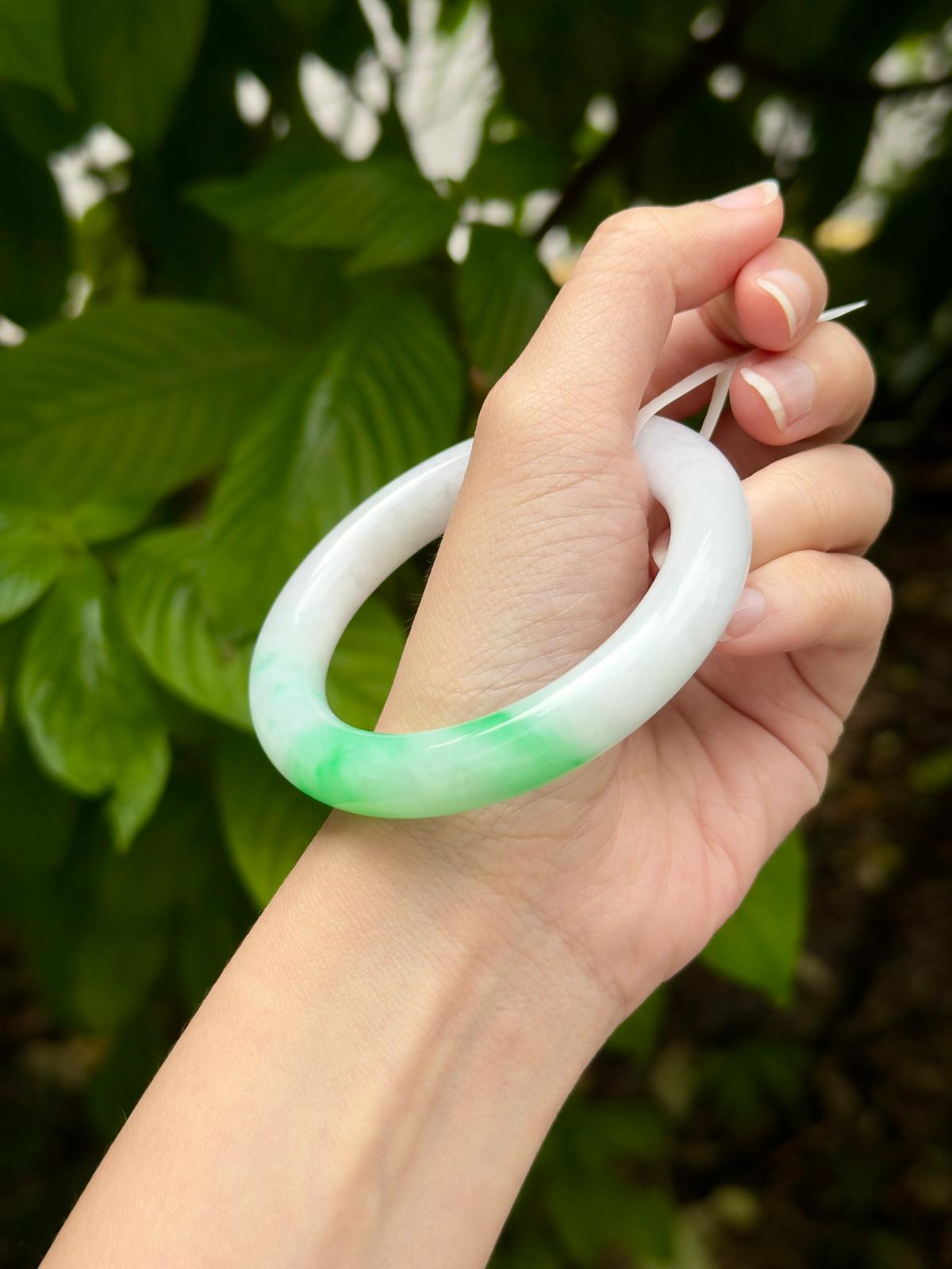 This rare thick-cut jadeite bangle features a stunning moss-on-snow effect, with vibrant sunny green on a clean white base. Crafted with very fine grains for this lively hue, it boasts a glutinous, mildly icy translucency that enhances its brilliance. Prized for its color vibrancy and premium cutting, this is free from cotton clouds or any dirt patches, making it an exceptional find.
