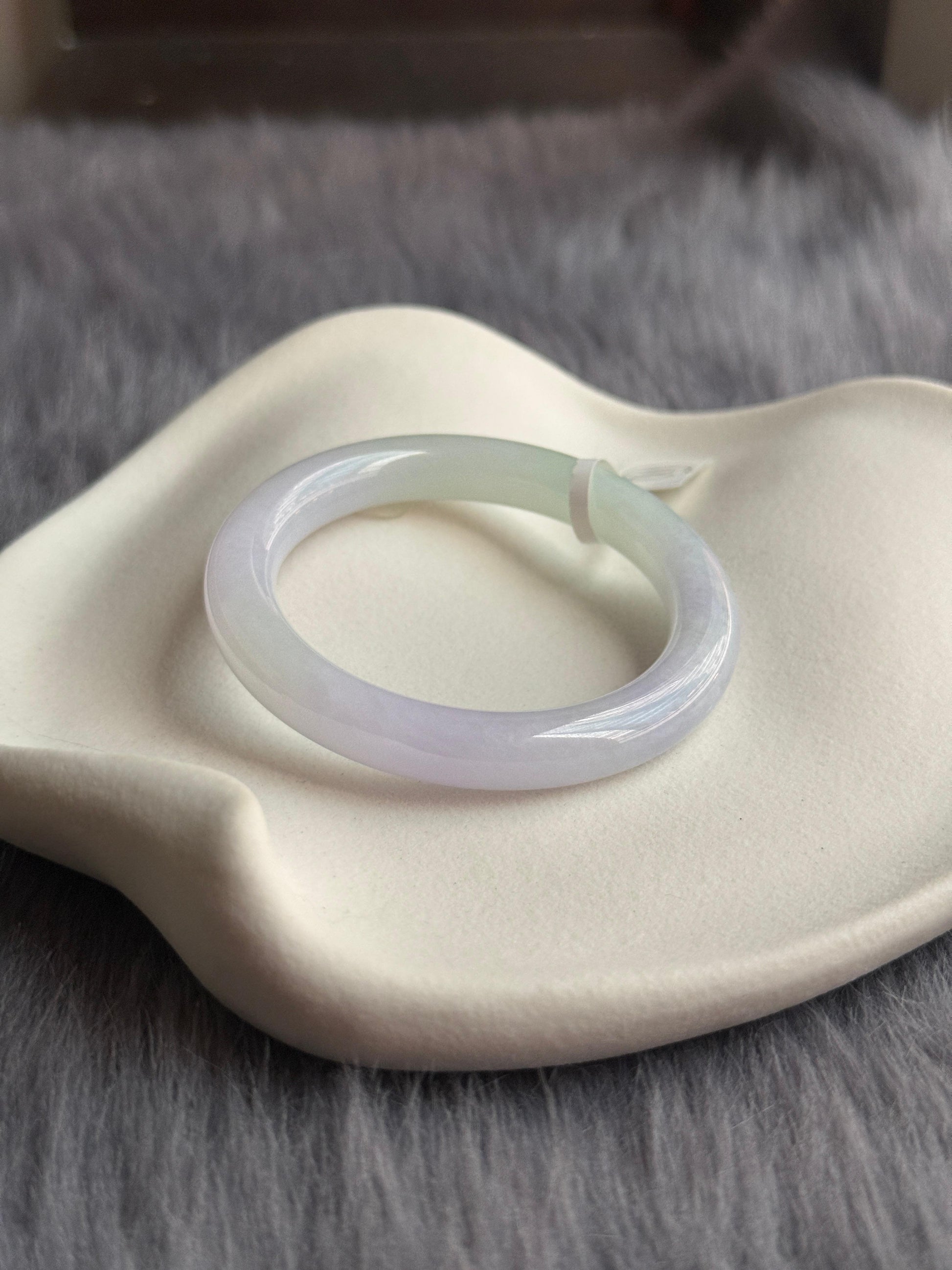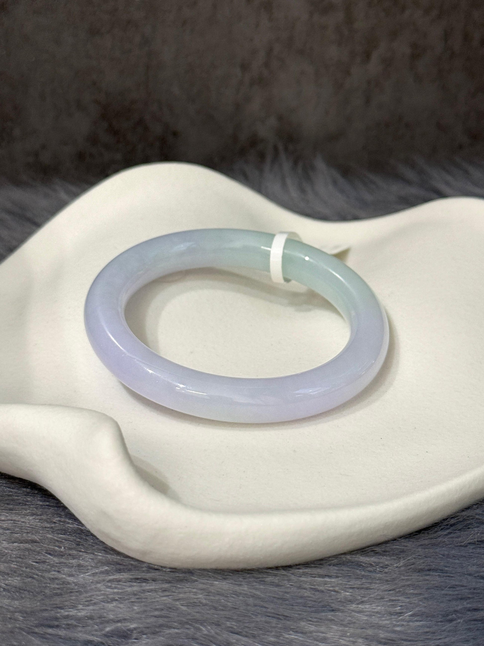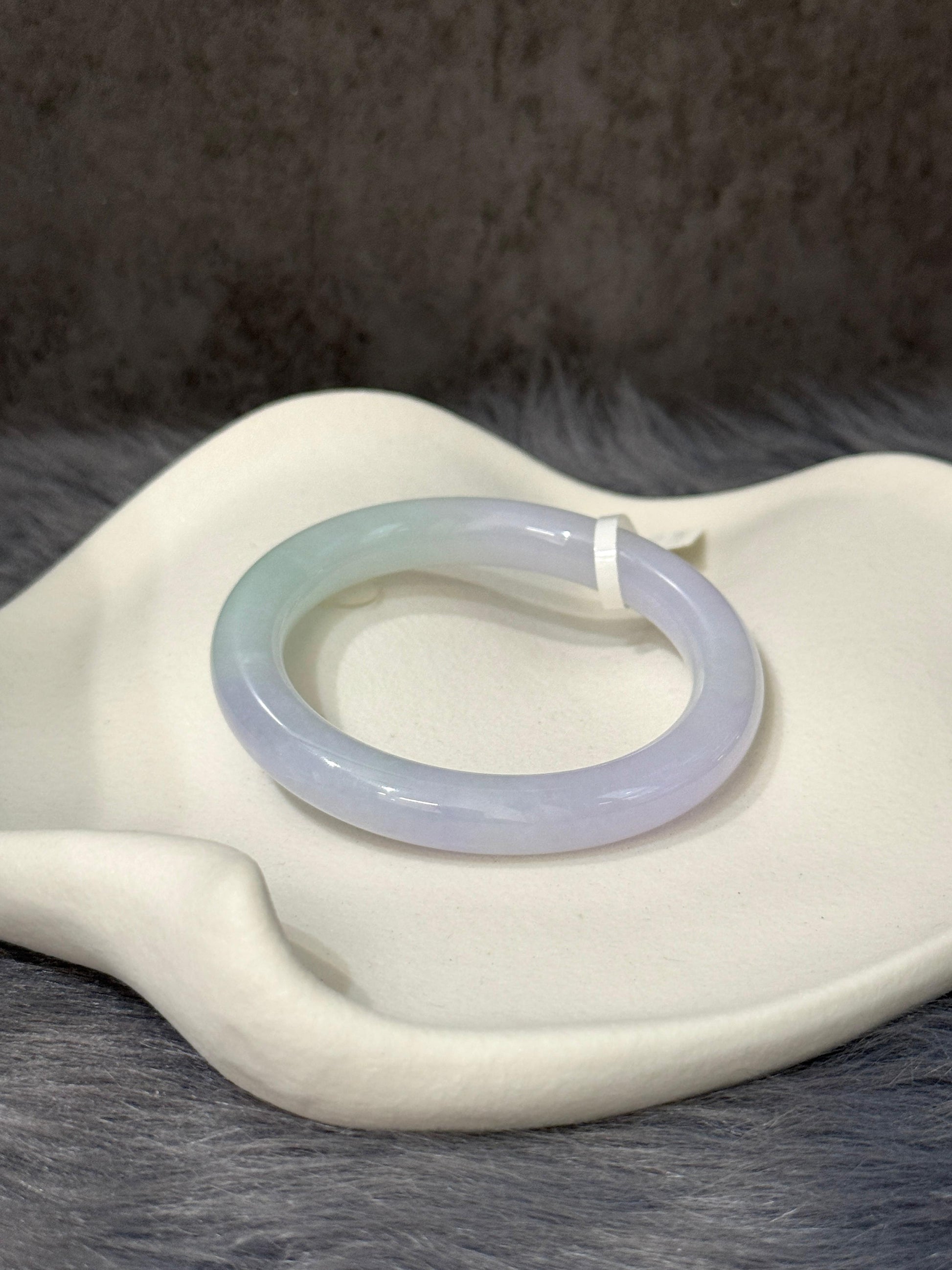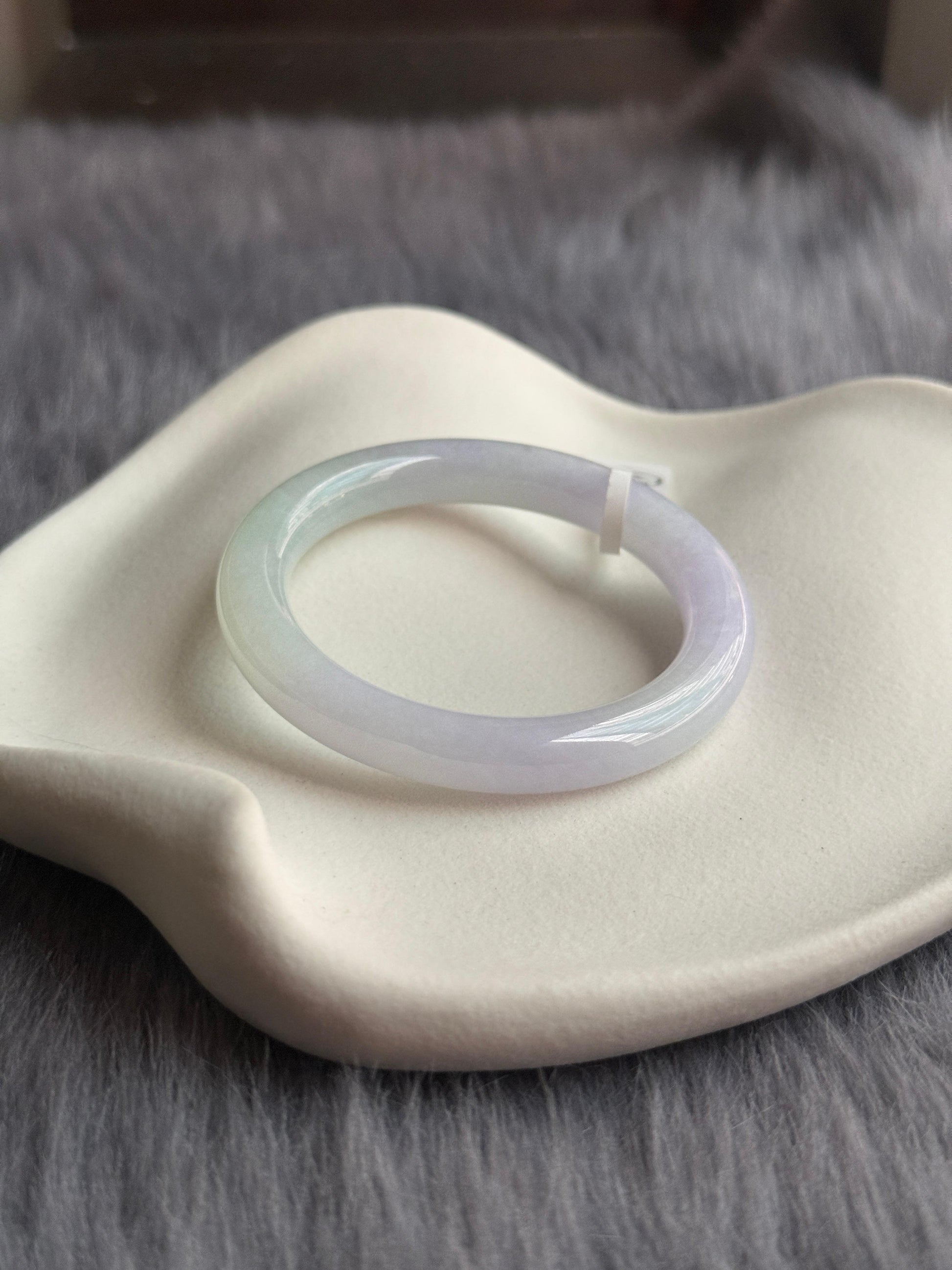 Translucent. In a vivid and vibrant shade of light pink lavender with pastel mint. It is a rare piece hardly found in petite sizes, almost like wearing pastel paddlepop ice cream on your wrist. We absolutely adore colors like this especially rare to find for natural jadeites. This piece has very refined grains with very good wateriness. It is a flawless piece with even consistency throughout.