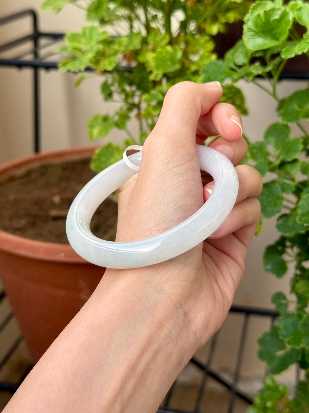 An icy clean white jadeite with good wateriness and refined grains. Flawless in quality, it is free from heavy cotton patches on the surface, dirt patches, stone-lines, veins, or cracks. A perfect starter or everyday bangle, style it your way!