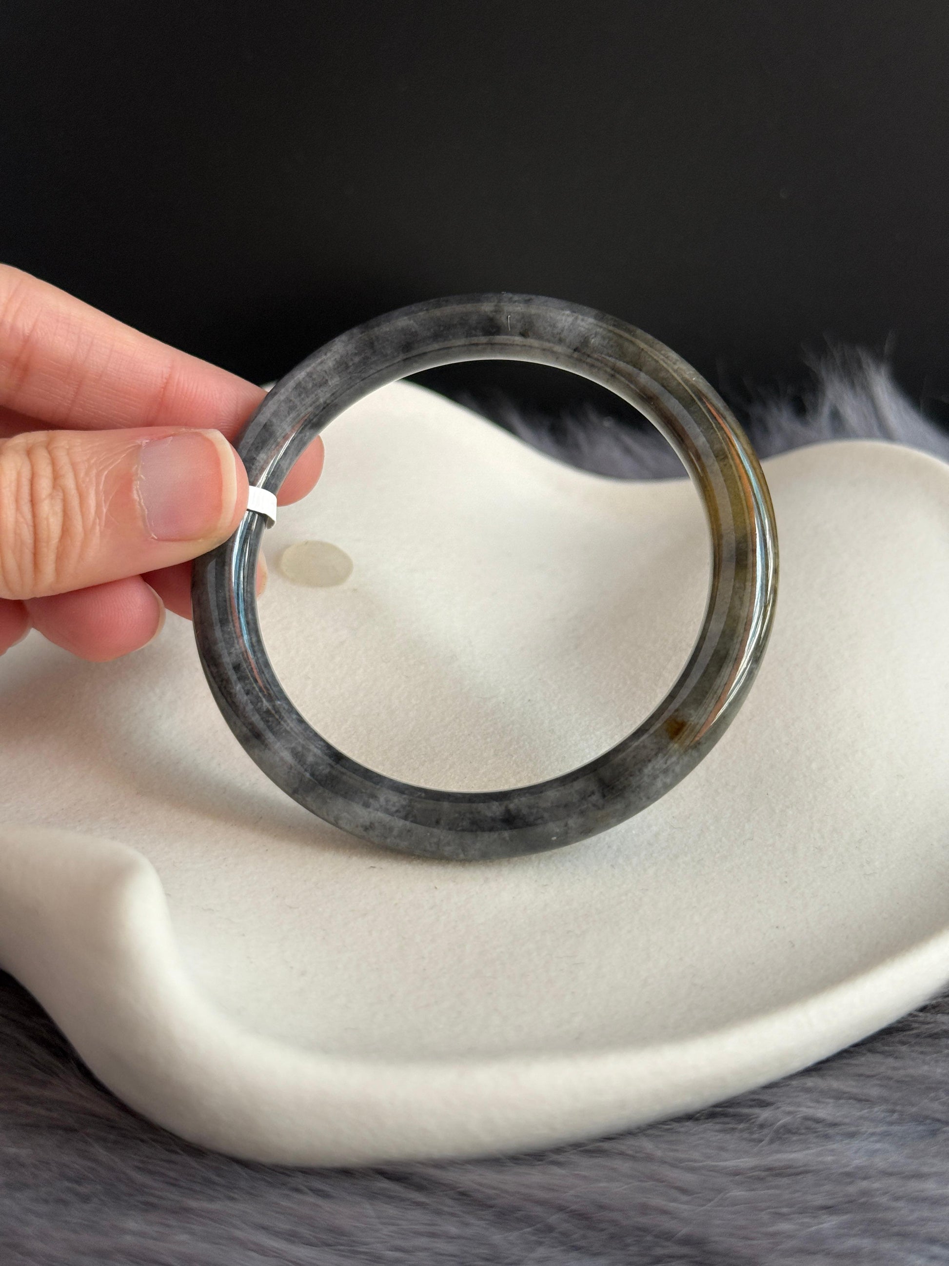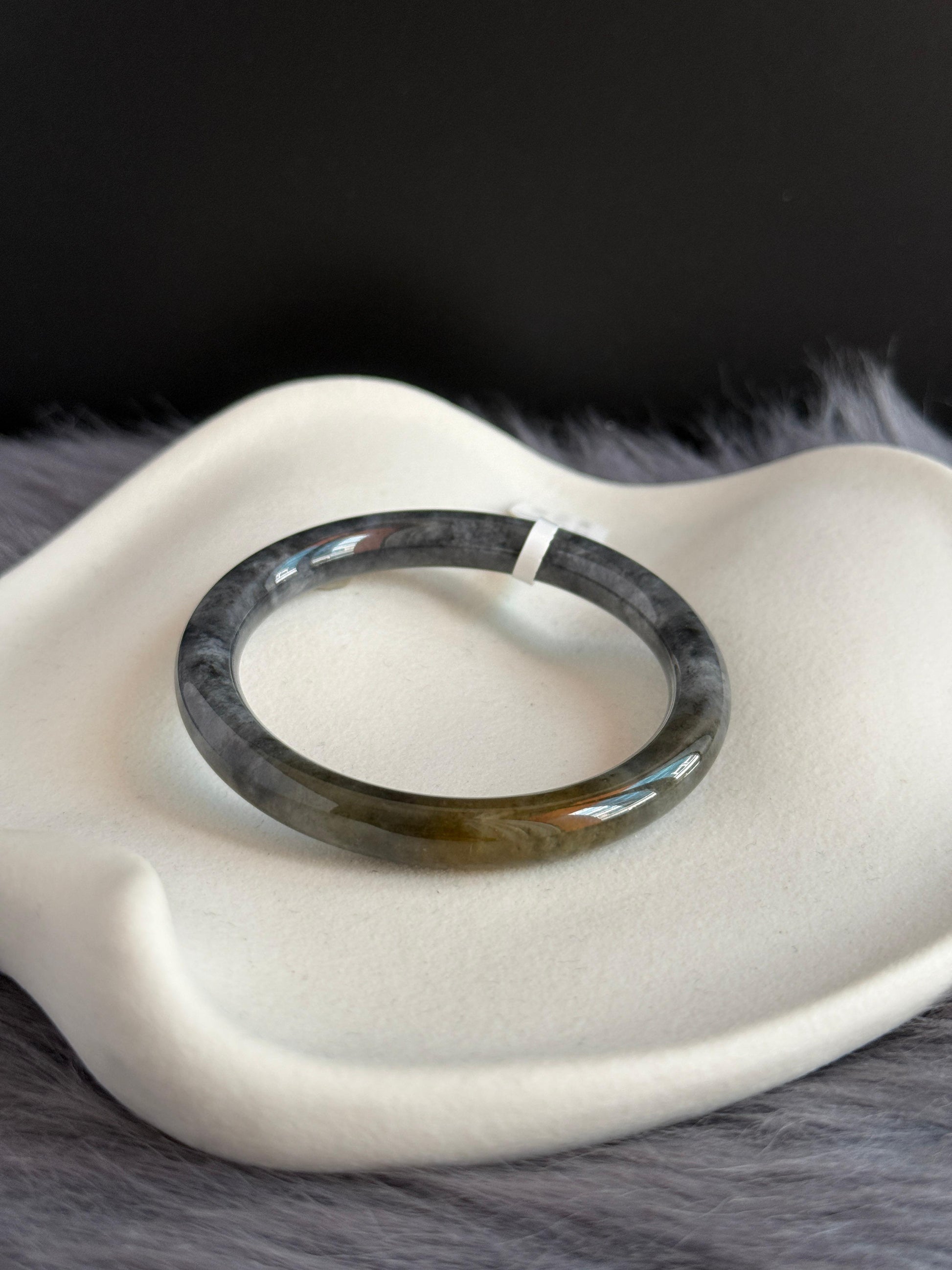 In a classic-slim cut, this Wuji bangle stands out with its deep, oily-black base with a pop of oily honey yellow — a step above the common matte blacks often seen in more affordable pieces. The honey yellow layer shows beautifully through its icy-glutinous translucency, finished with a luminous, refined shine.