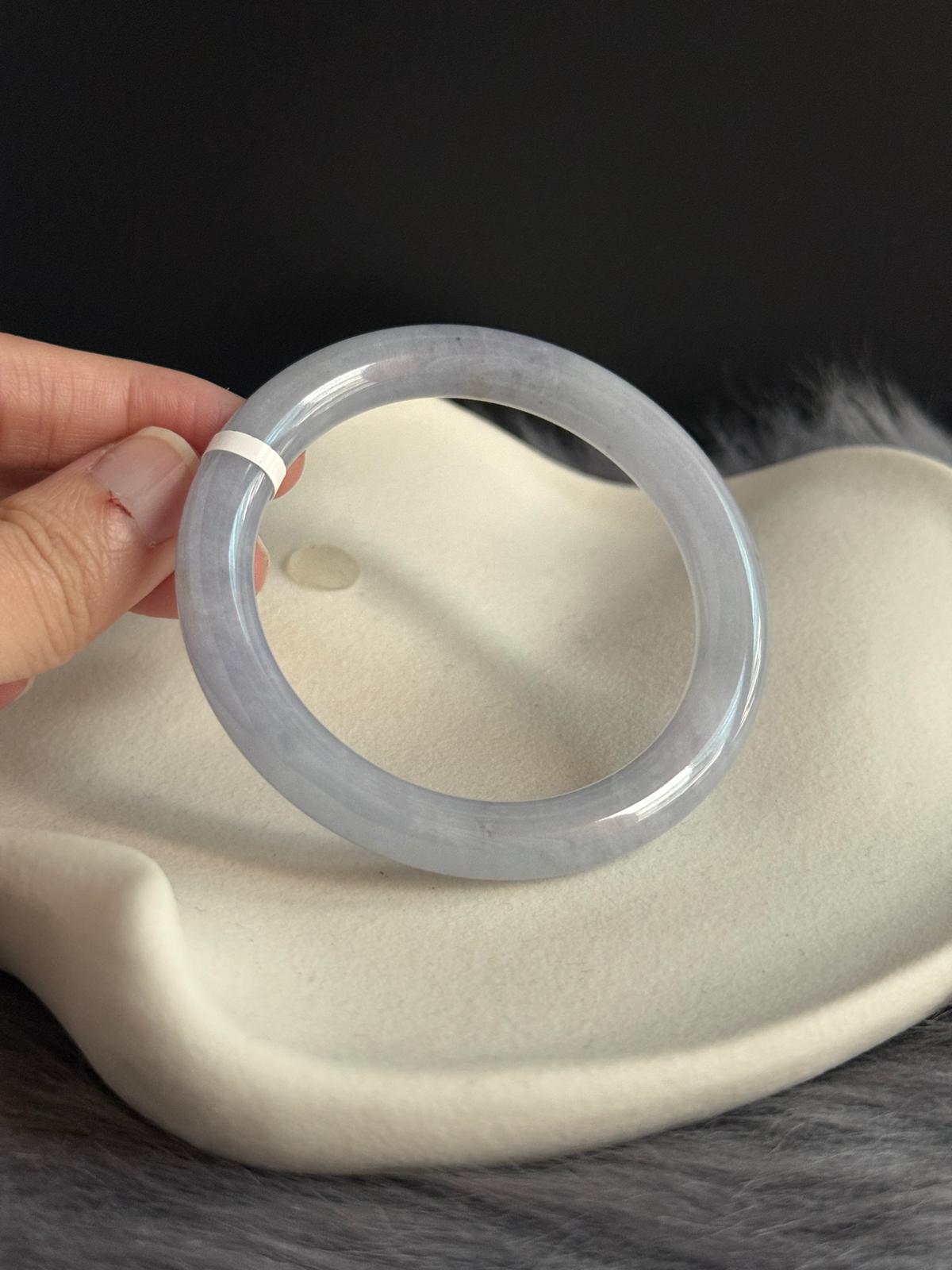 This icy bluish lavender bangle features subtle glow with gradient colouration. The vivid bluish lavender hue, combined its excellent water and icyness creates a serene, enchanting piece. Its smooth texture and refined details make it a perfect choice for those who appreciate timeless, artistic elegance. It is free from lines, veins, or cracks.