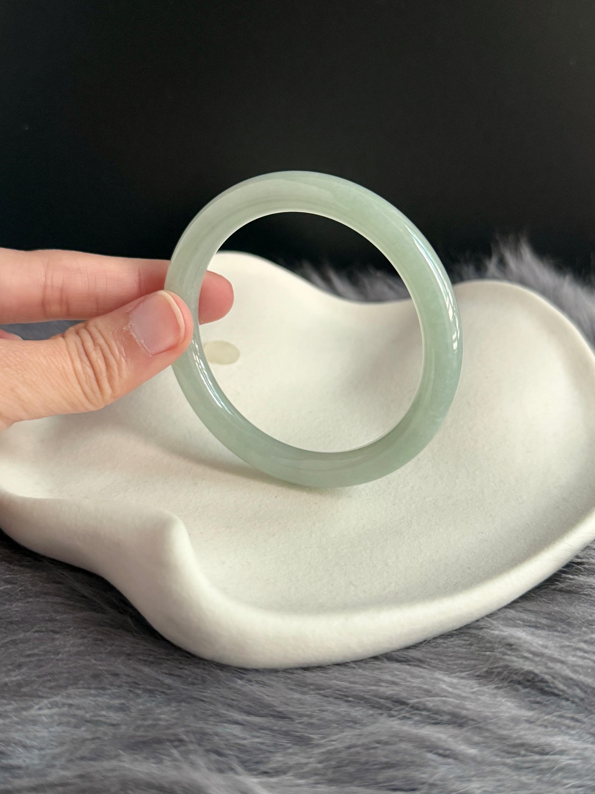 In a pleasing light sweet green coloration with very good wateriness, in an icy-glutinous translucency. This vibrant and intense sweet green bangle has really good translucency and wateriness. In a pretty good thickness of 8.5mm, this bangle is suitable as a first jadeite bangle without weighing down your wrist. This piece does not have any cottony vibes or stone veins nor cracks, a strong candidate in the 2K+ range.