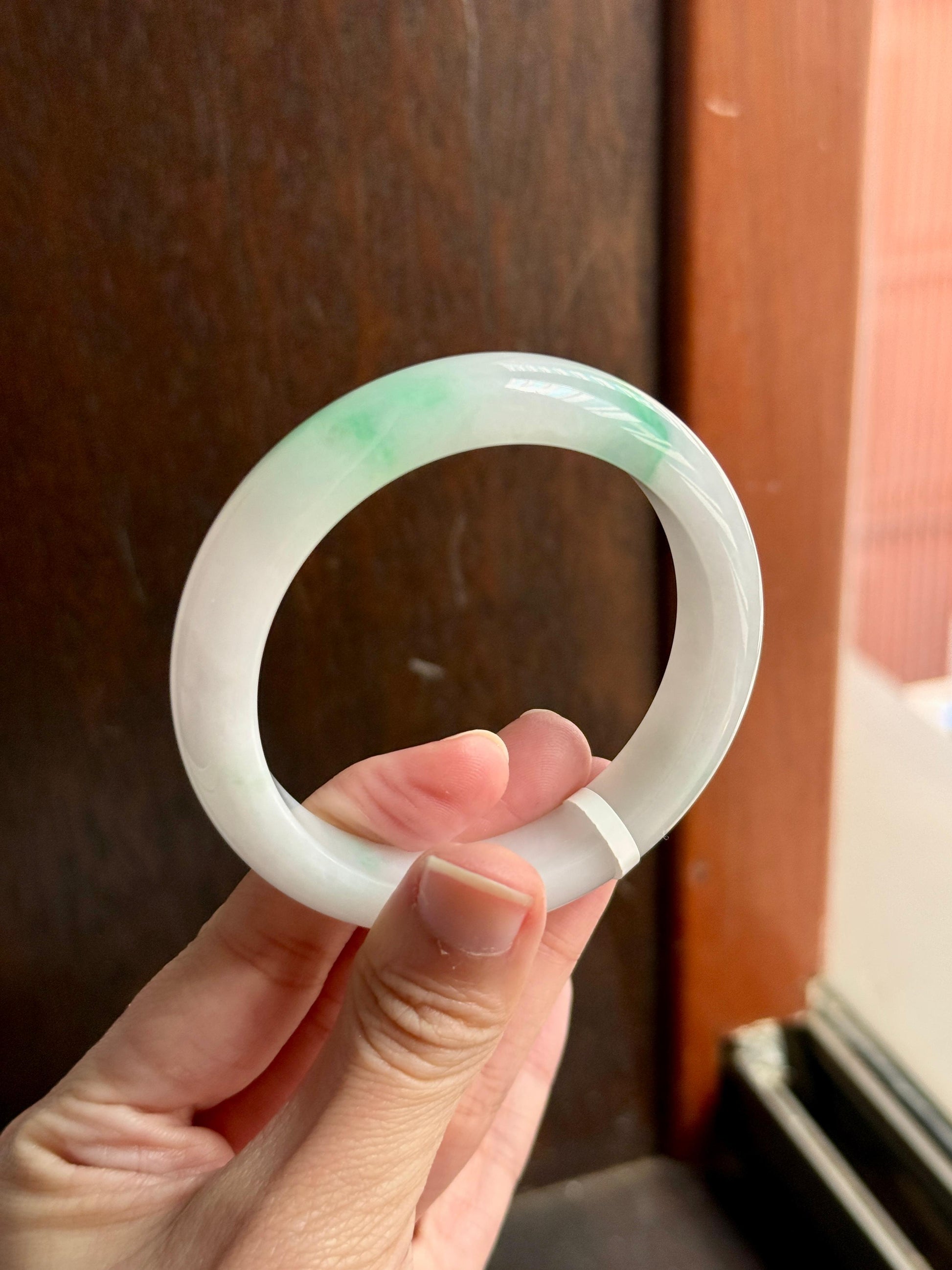 Translucent | This rare thick-cut jadeite bangle features a stunning moss-on-snow effect, with vibrant sunny green on a clean porcelain white base. Crafted with very fine grains for this lively hue, it boasts a glutinous, mildly icy translucency that enhances its brilliance. Prized for its refined grains, good water and premium cutting, this is free from internal lines, cotton clouds or any dirt patches, making it an exceptional find.
