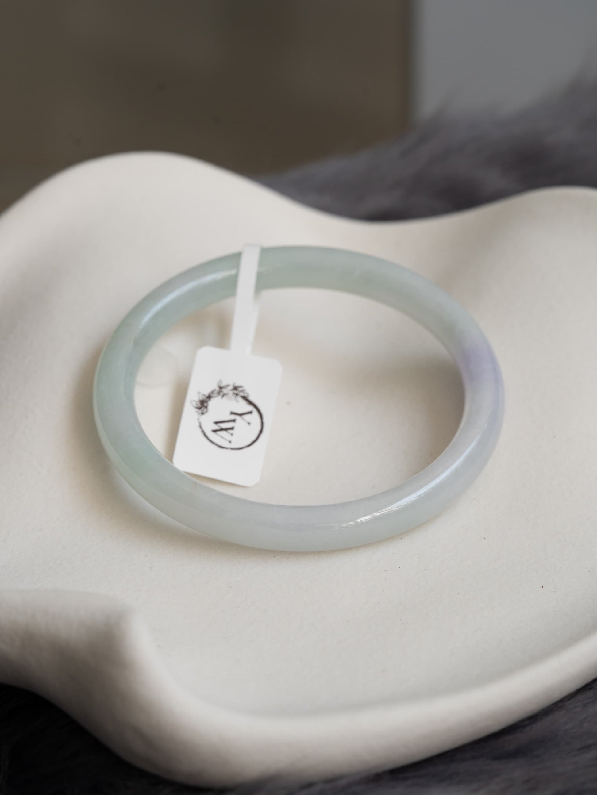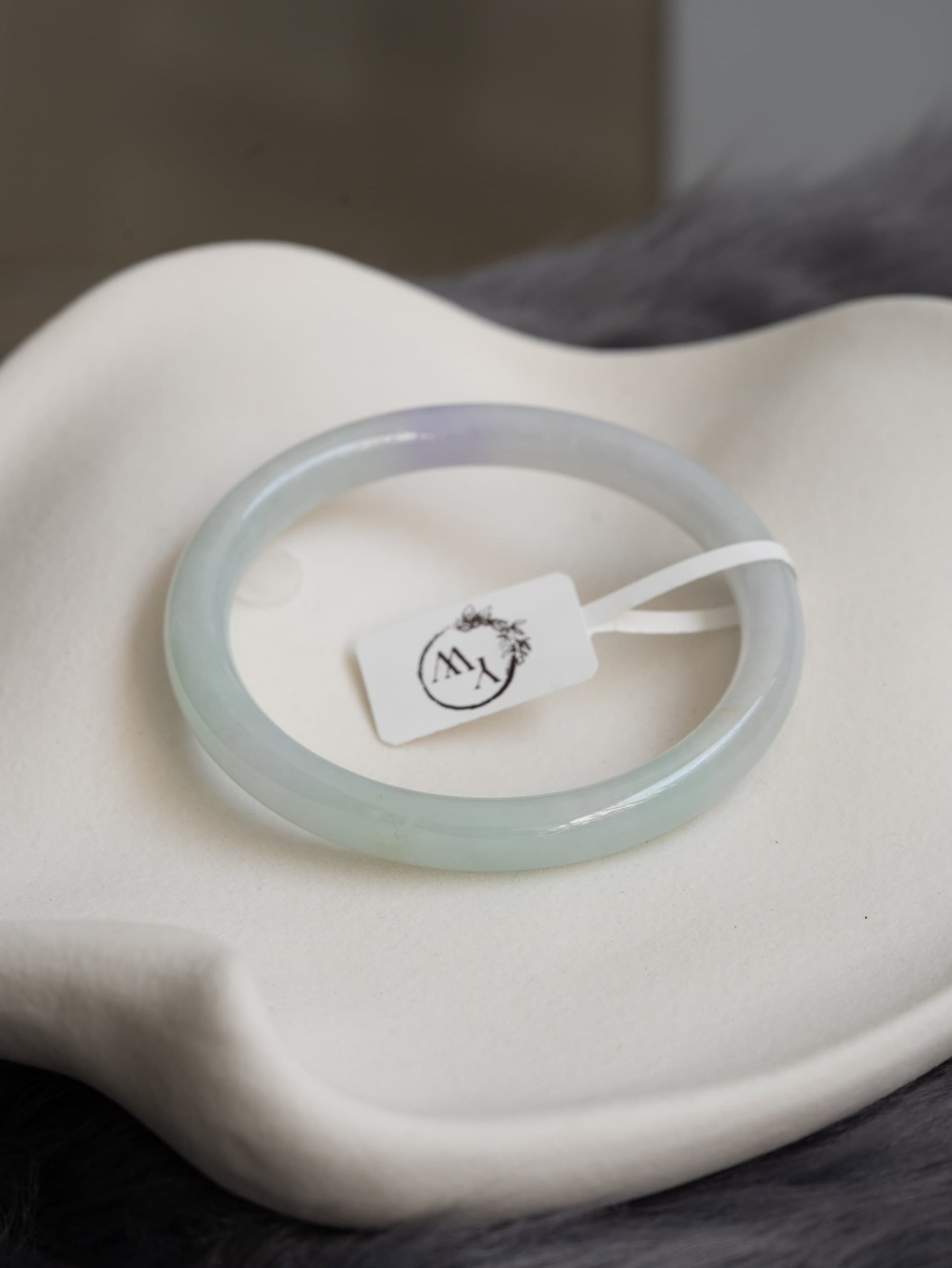 Translucent. In a gentle shade of mint green with a dash of lavender. This piece is carved in a 7mm slim cut, perfect for daily wrist stacks. This piece has a line that can be felt with fingernails, no through cracks.