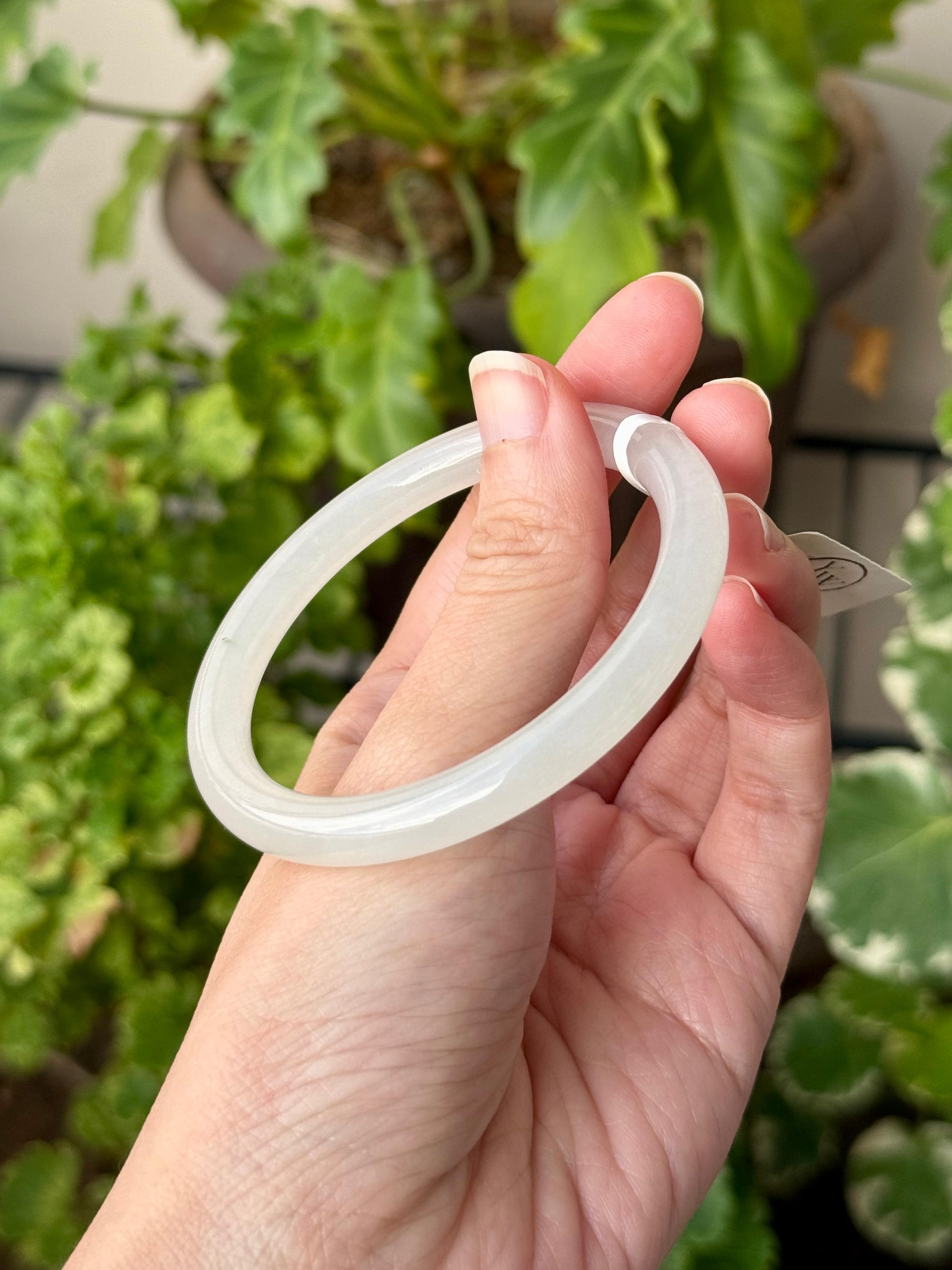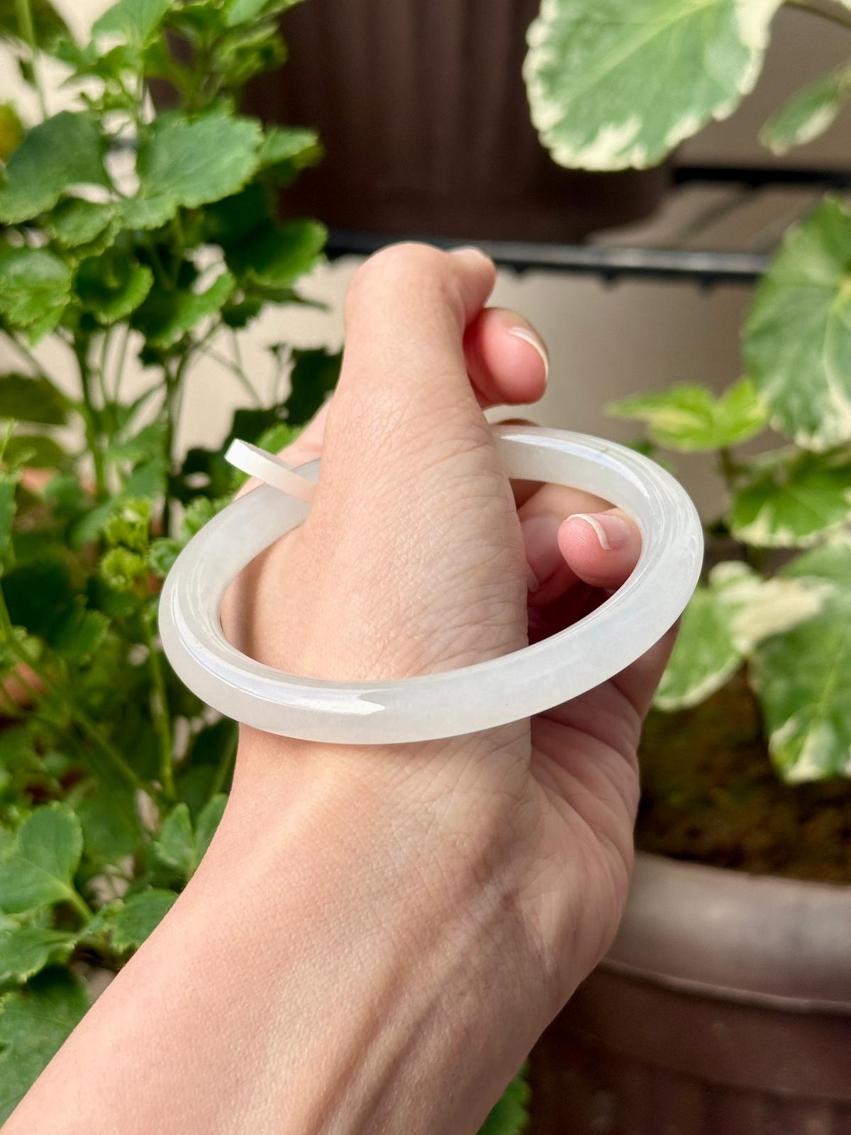 An icy and glowy slim cut white jadeite good wateriness and remarkable translucency and refined grains. Flawless in quality, it is free from heavy cotton patches on the surface, stone-lines, veins, or cracks, making it a perfect for everyday bangle. Traditional market price typically above S$6,000.