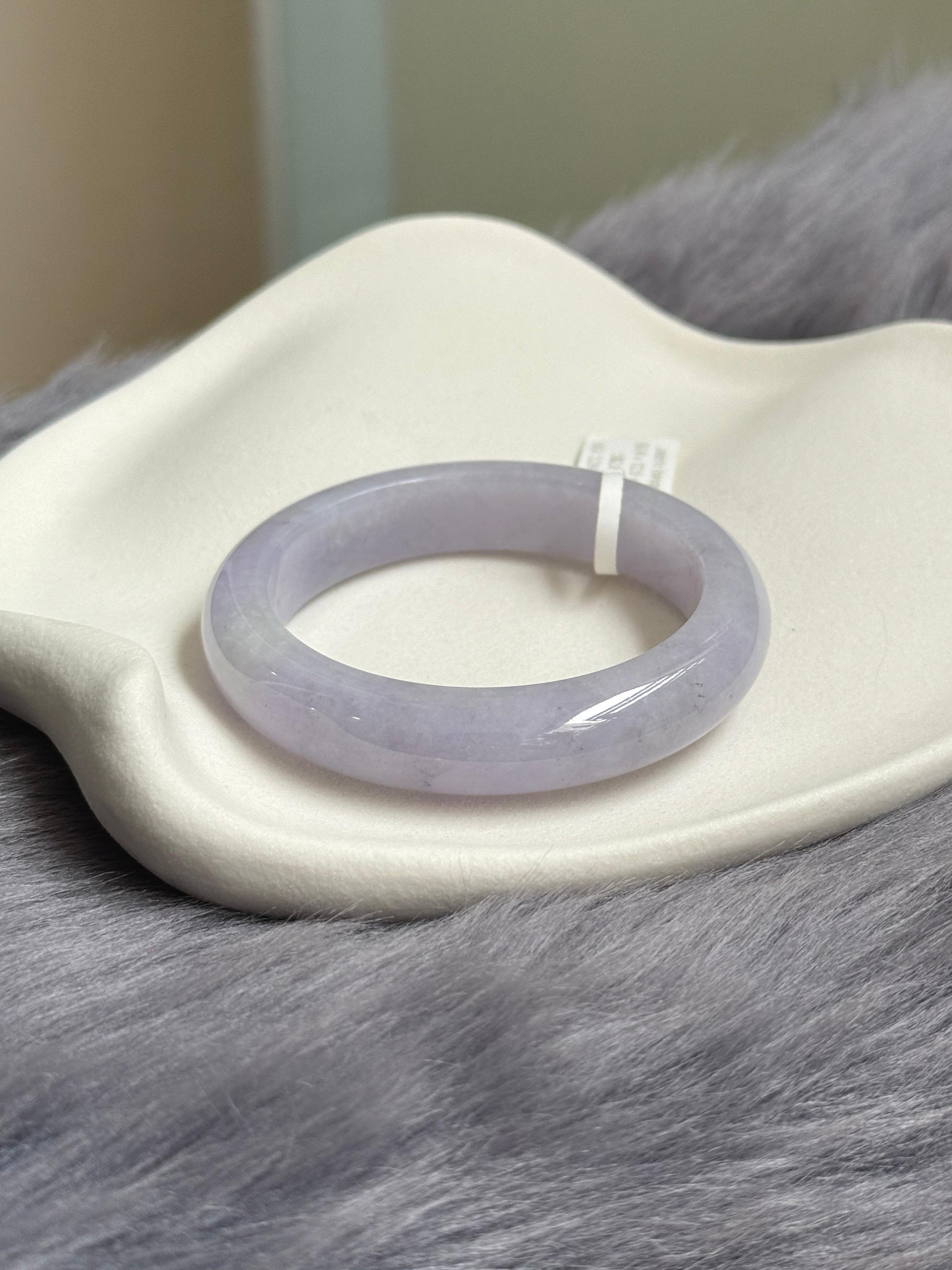 This piece features a soft, delicate lavender hue with fine grains and subtle Wuji specks, adding character to its natural beauty. It remains translucent in sunlight, with a gentle lavender glow that is slightly more pronounced indoors. A unique piece with a graceful, understated charm. It is free from lines, veins, or cracks.