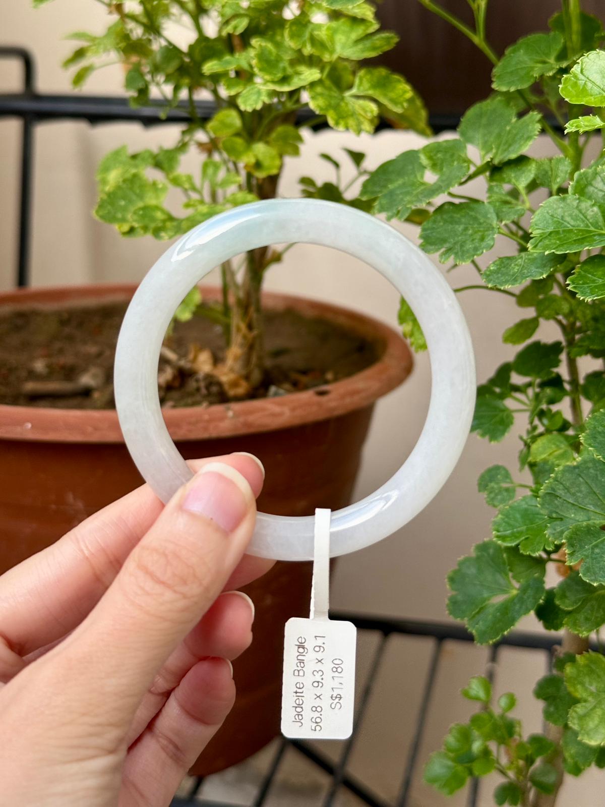An icy clean white jadeite with good wateriness and refined grains. Flawless in quality, it is free from heavy cotton patches on the surface, dirt patches, stone-lines, veins, or cracks. A perfect starter or everyday bangle, style it your way!