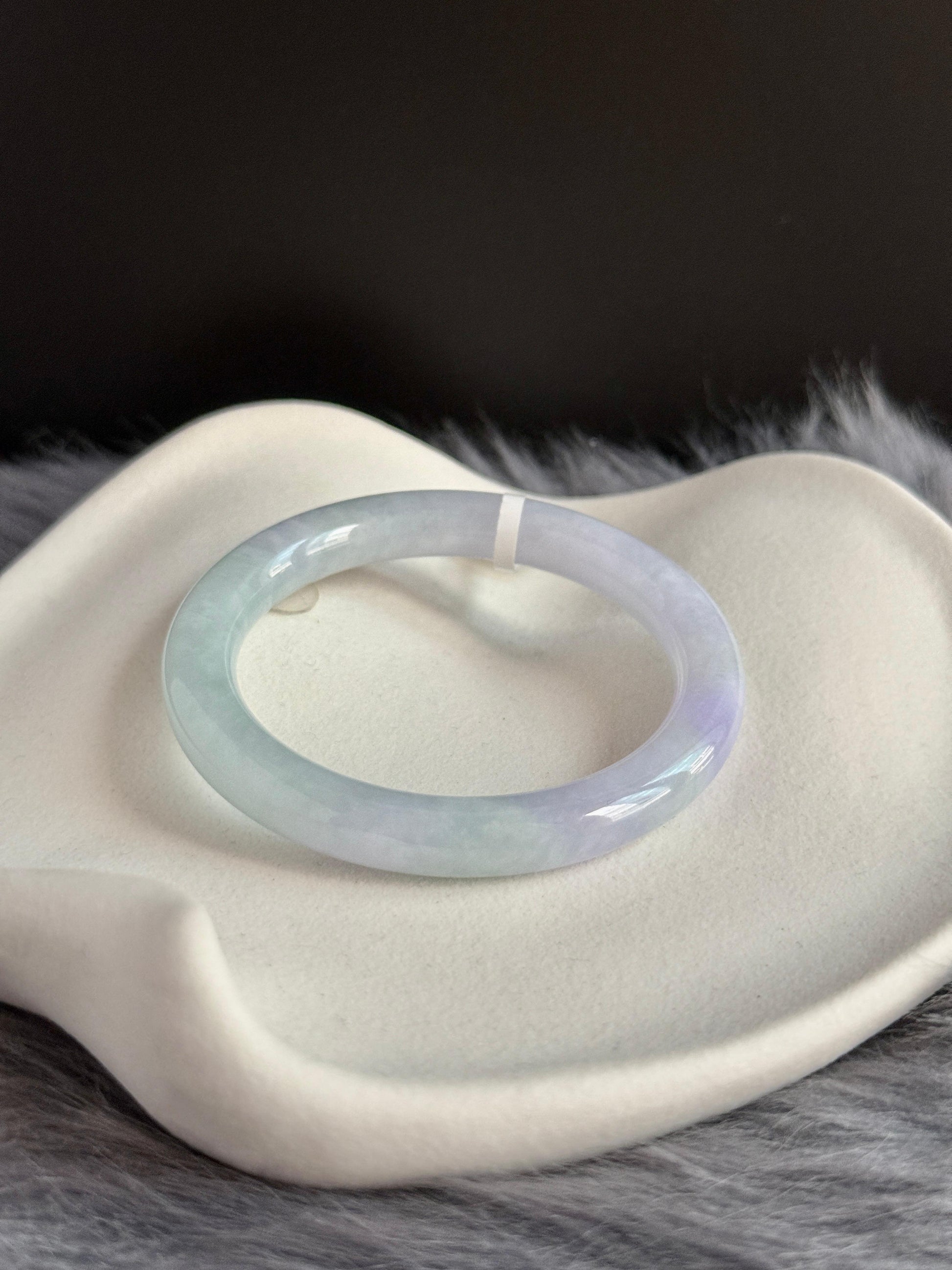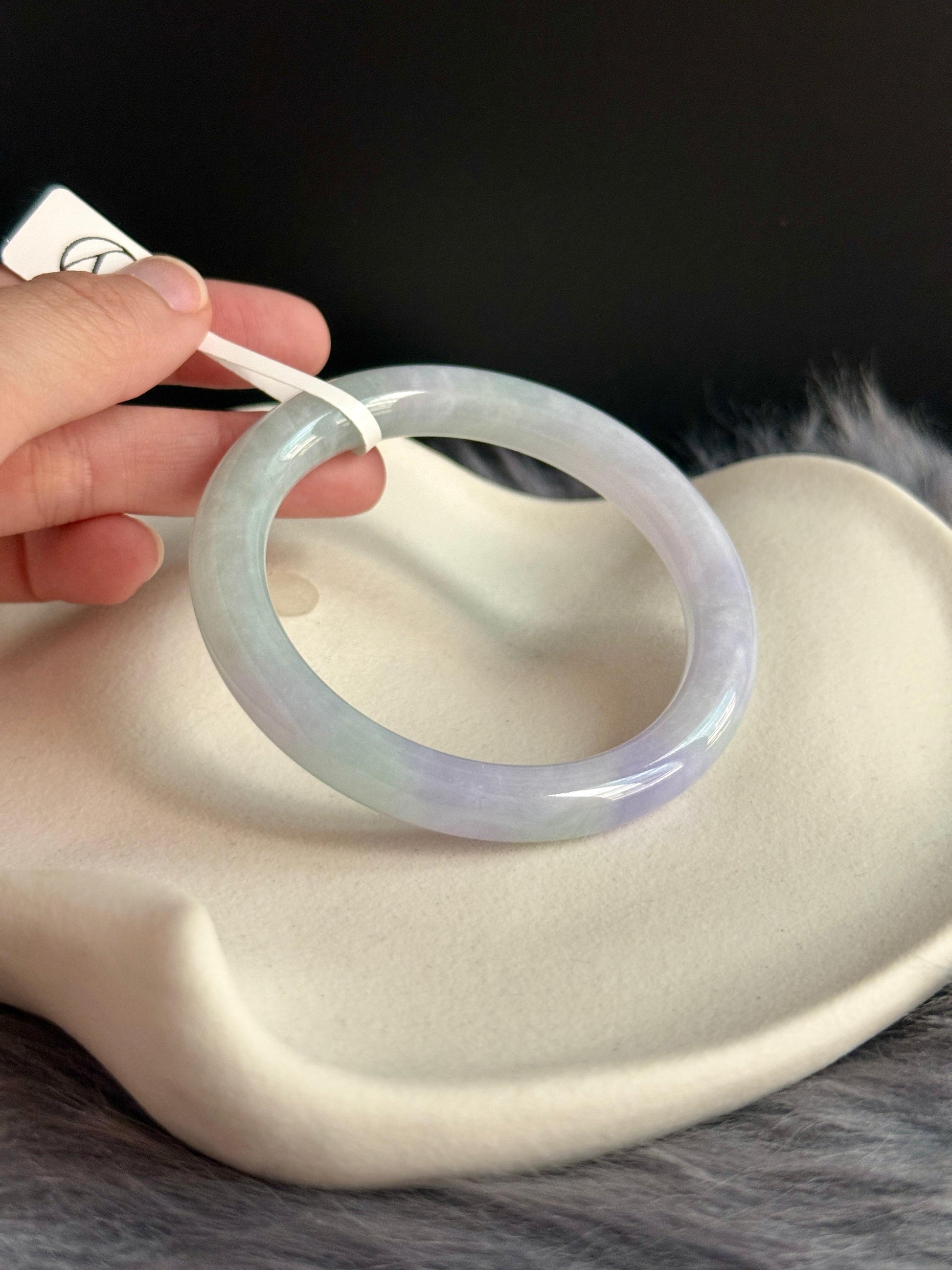 Translucent. In a vivid and vibrant shade of red-hued lavender with a cool-toned mint green, its a rarer shade of mint green instead of the warmer light greens usually seen on chuncai pieces. This piece look almost like wearing paddlepop on your wrist with a touch of red. We absolutely adore colors like this especially rare to find for natural jadeites. This piece has refined grains with very good wateriness, in the most classic cut of 9.8mm.