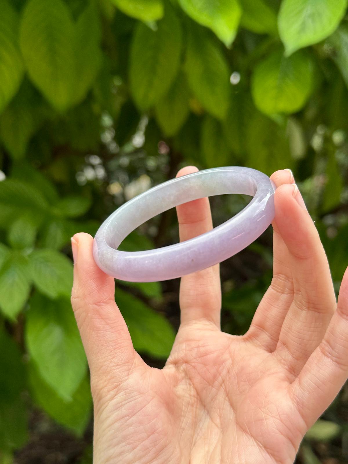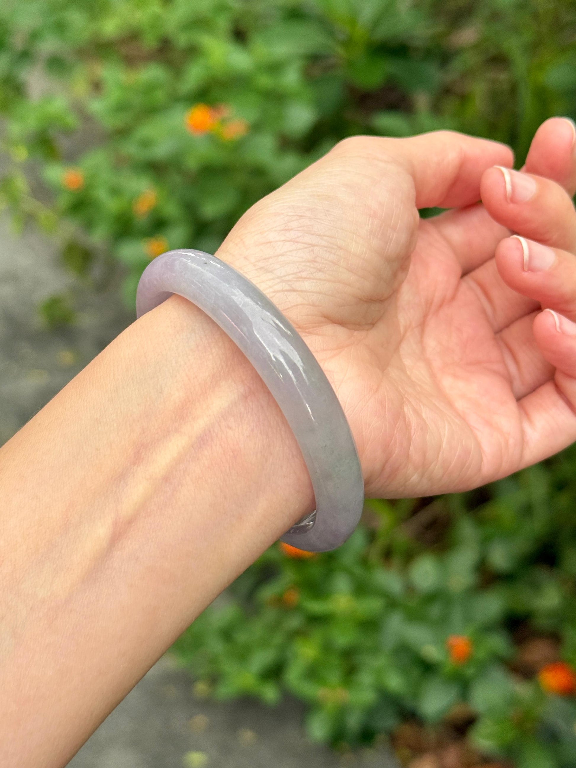 This icy smoky lavender piece features unique intense and vivid red-hued lavender with dark bluish green jadeite green at the other side of the bangle. Main highlights of this piece: good icyness with very good wateriness and very refined grains for a lavender jadeite.