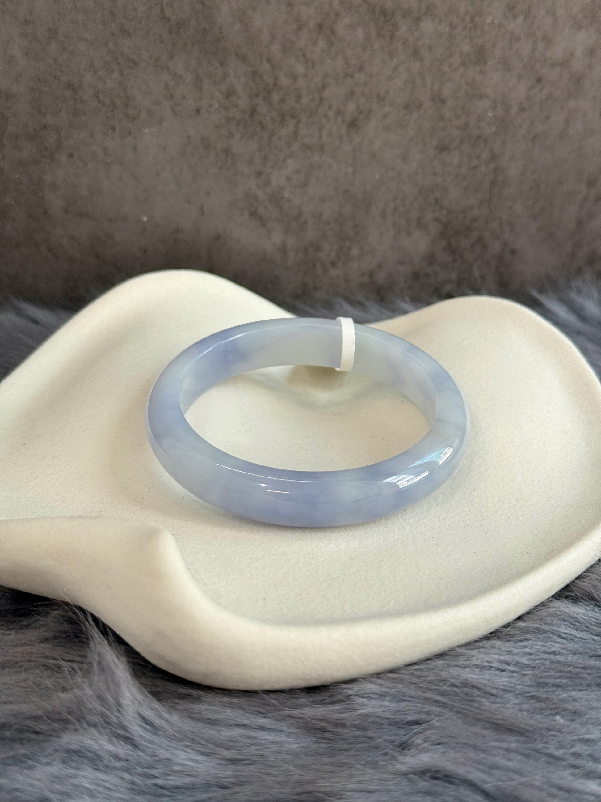 This blue-hued lavender jadeite bangle is a rare flawless piece, featuring an exquisitely refined grain texture with an icy glutinous translucency. Prized for its rich colors and very refined grains, it is a beautiful choice for both daily wear and collection, combining elegance with rarity.