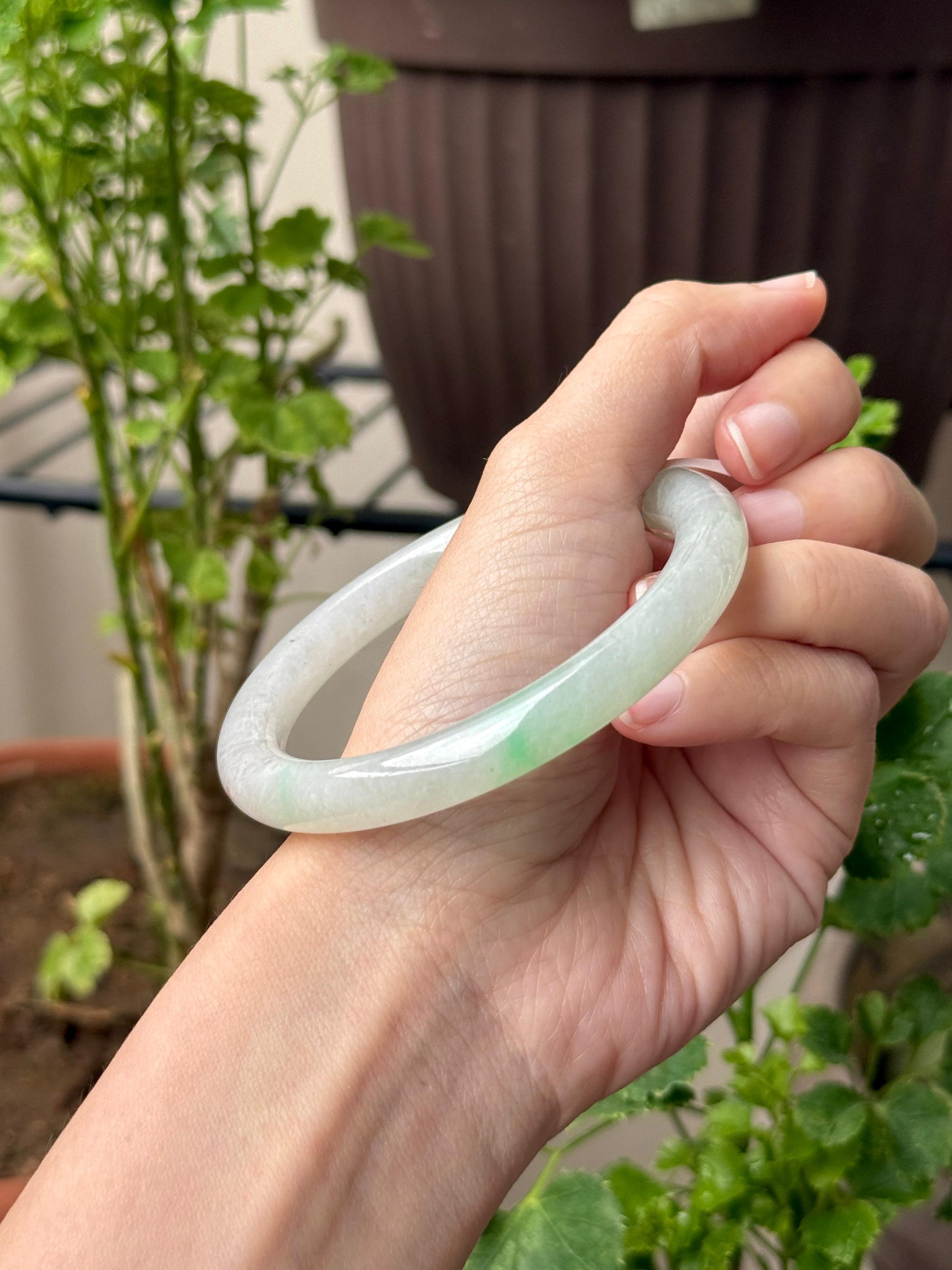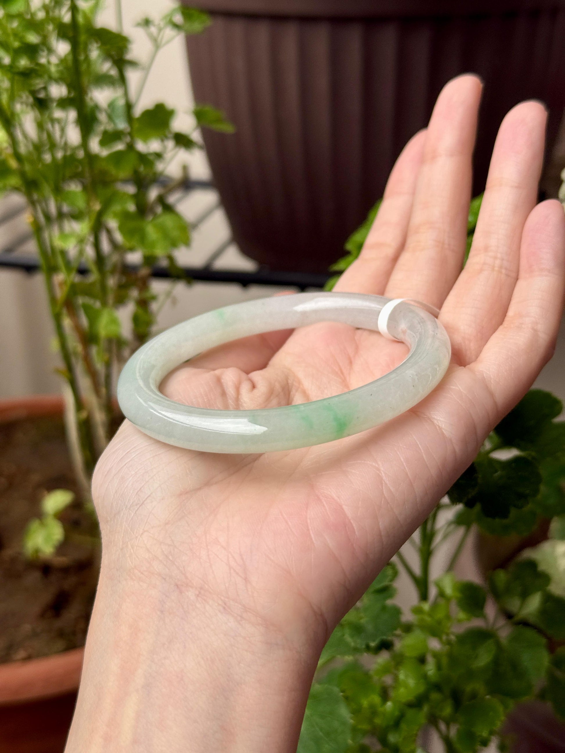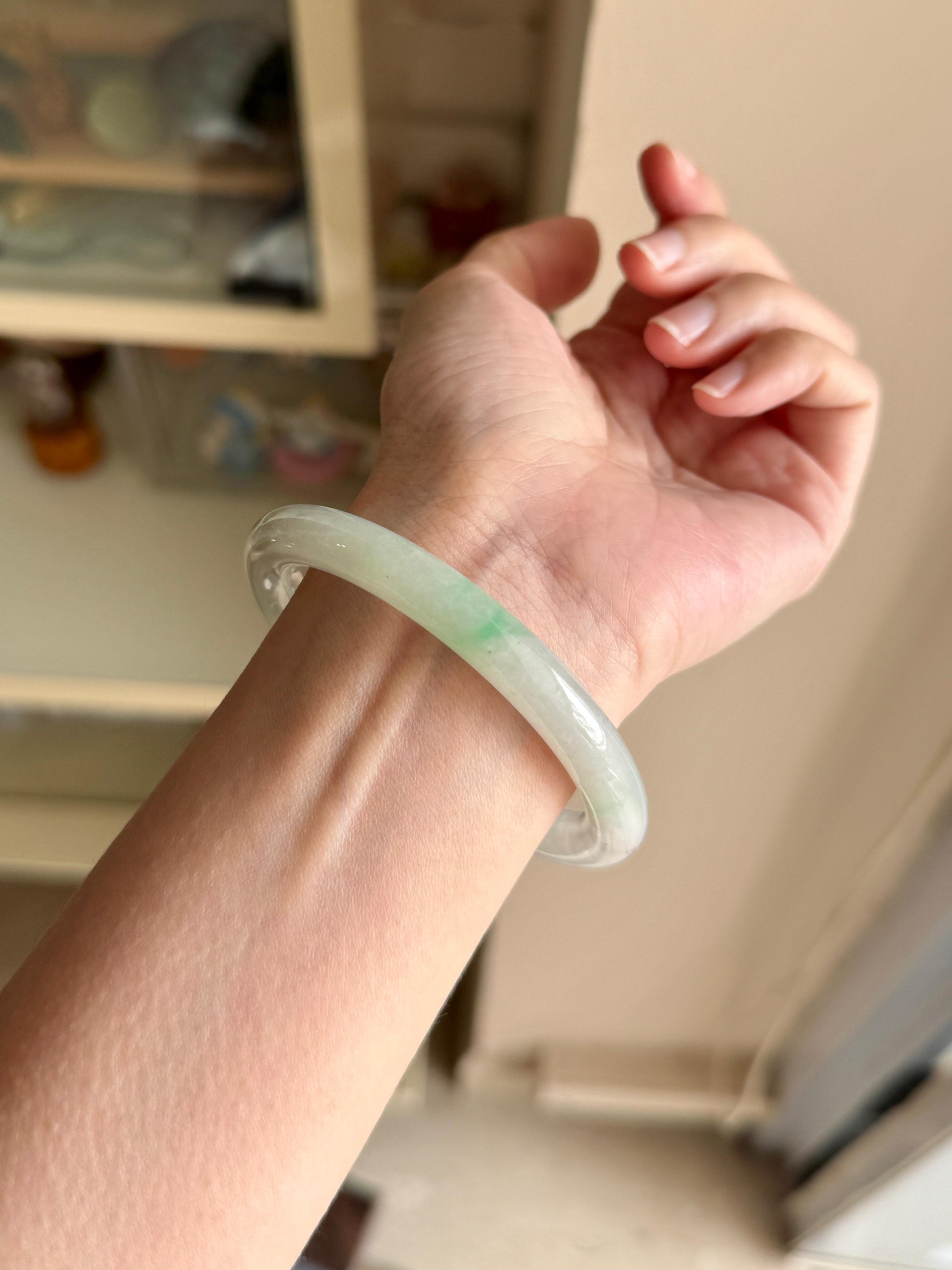 This white-based jadeite bangle features vibrant sunny green splashes, showcasing its good wateriness and icyness. With a glutinous icy translucency, it looks really refreshing on the wrist. A beautiful piece that is both affordable and versatile, making it perfect for daily wear. Presence of chromium and iron oxide mineral flecks, giving it an unique character.