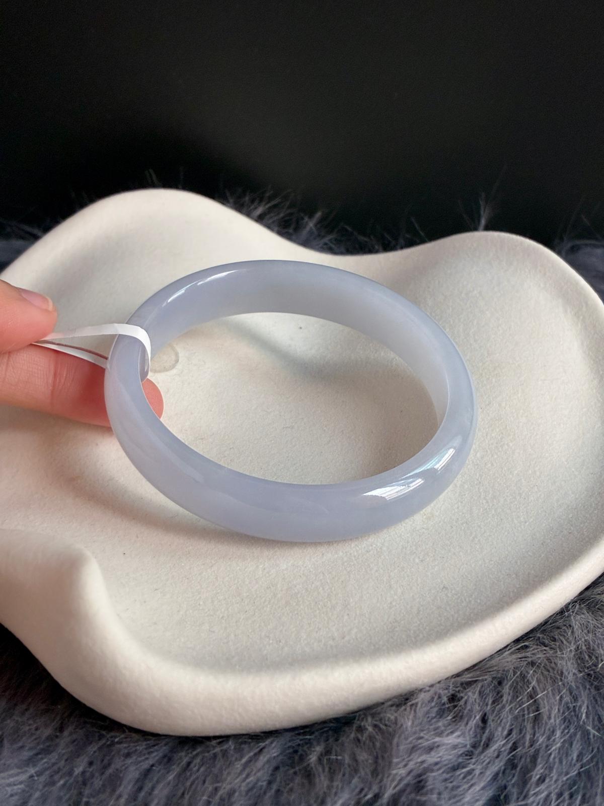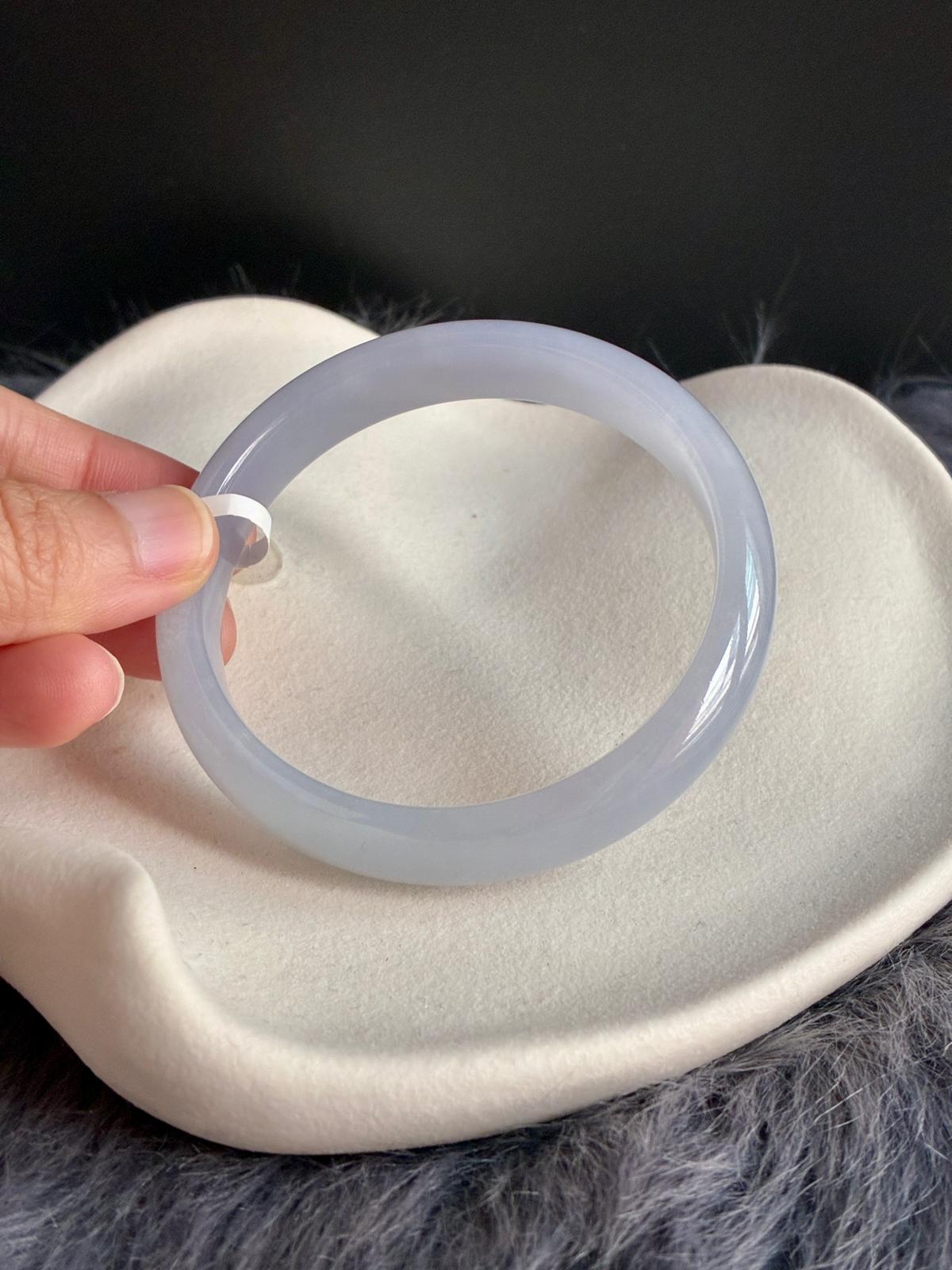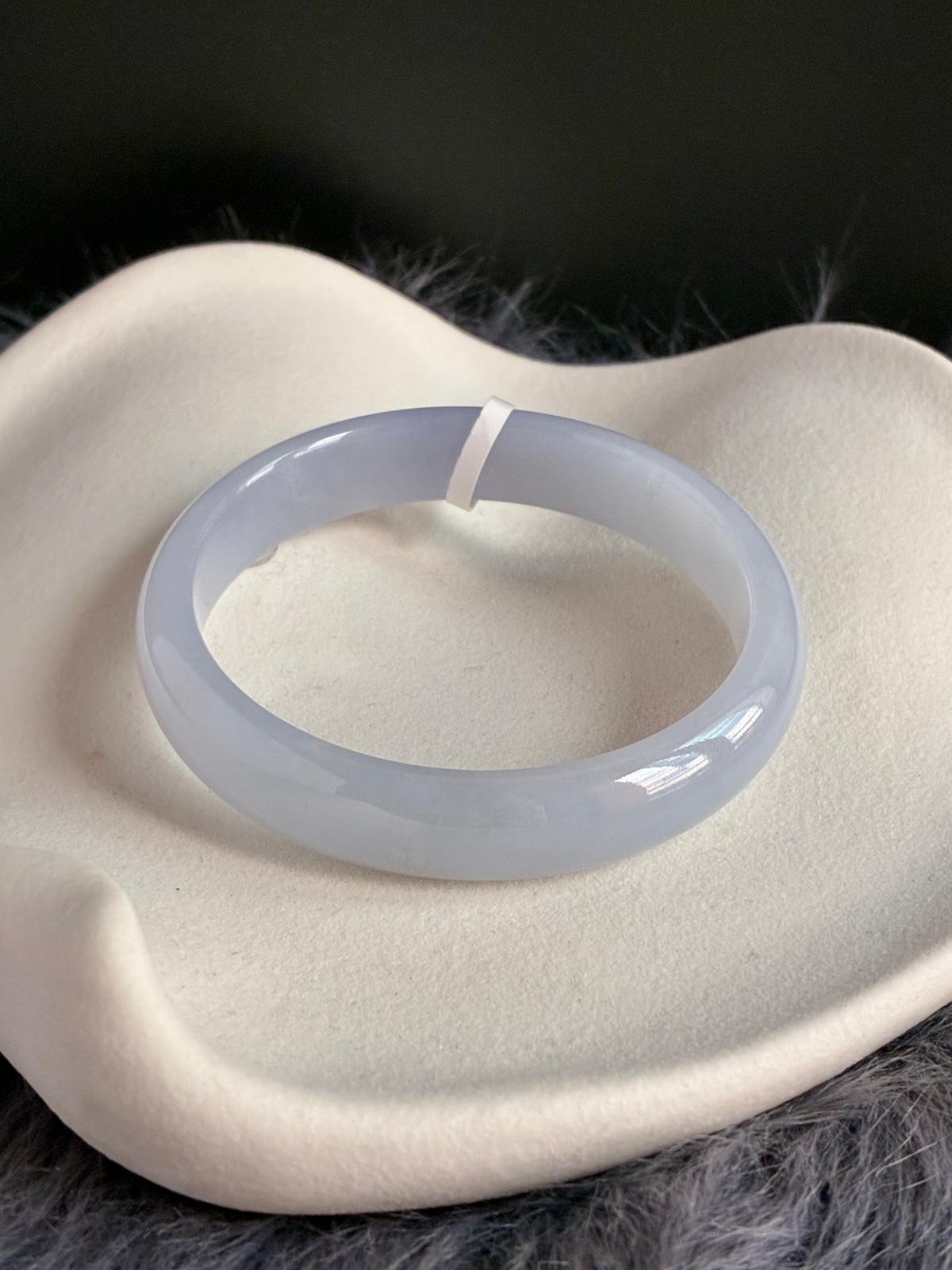 An icy, jelly-like lavender jadeite bangle with a gentle bluish undertone, free from any greyness. The material is exceptionally fine, with a poreless, baby-skin texture that gives it a smooth, almost weightless glow.