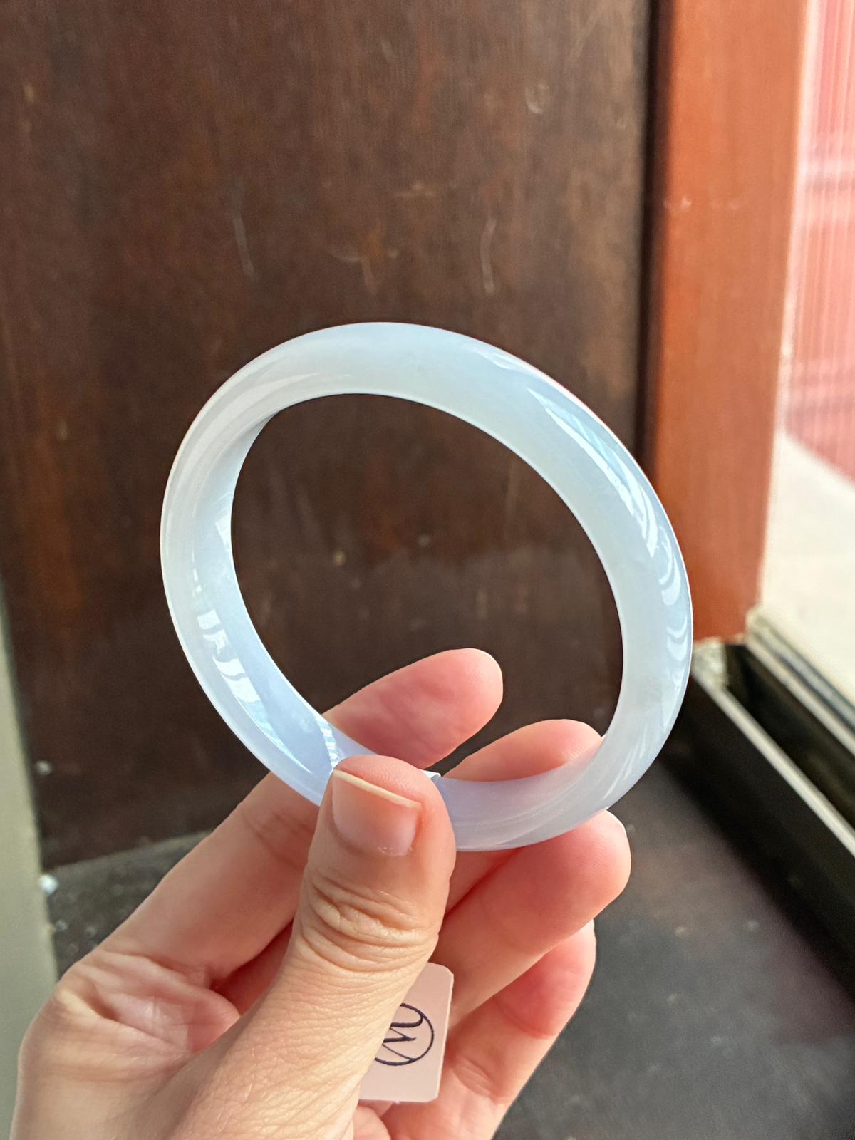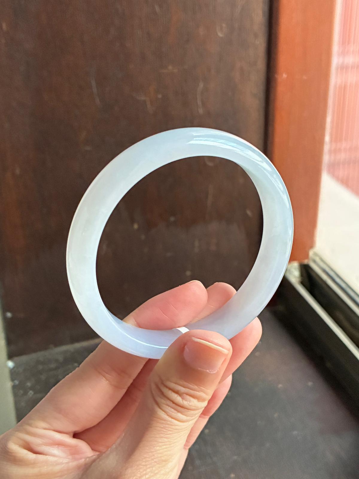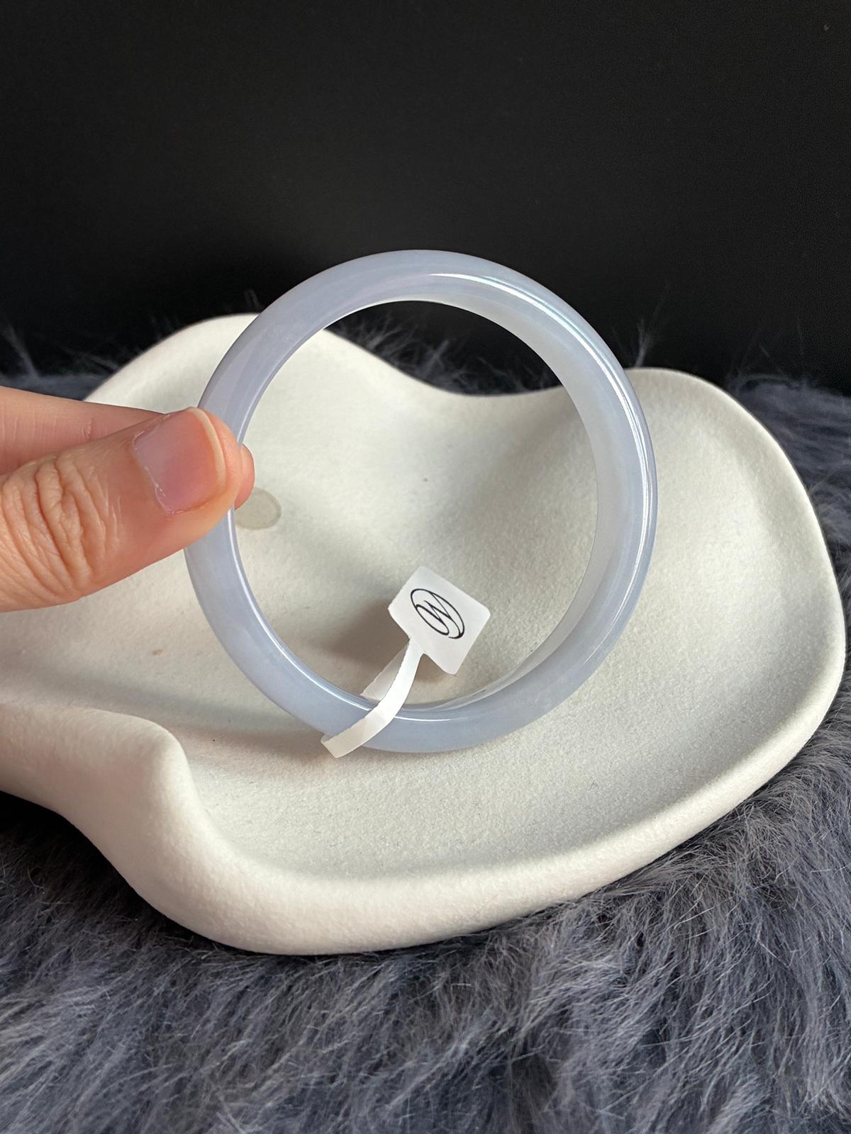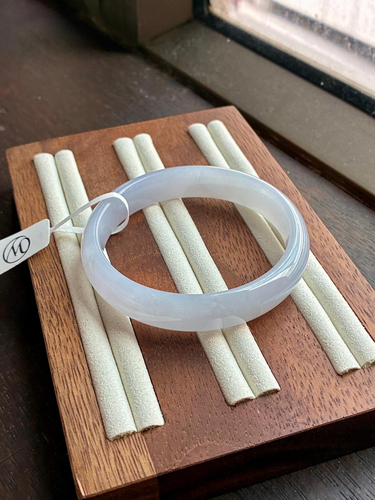An icy, jelly-like lavender jadeite bangle with a gentle bluish undertone, free from any greyness. The material is exceptionally fine, with a poreless, baby-skin texture that gives it a smooth, almost weightless glow.