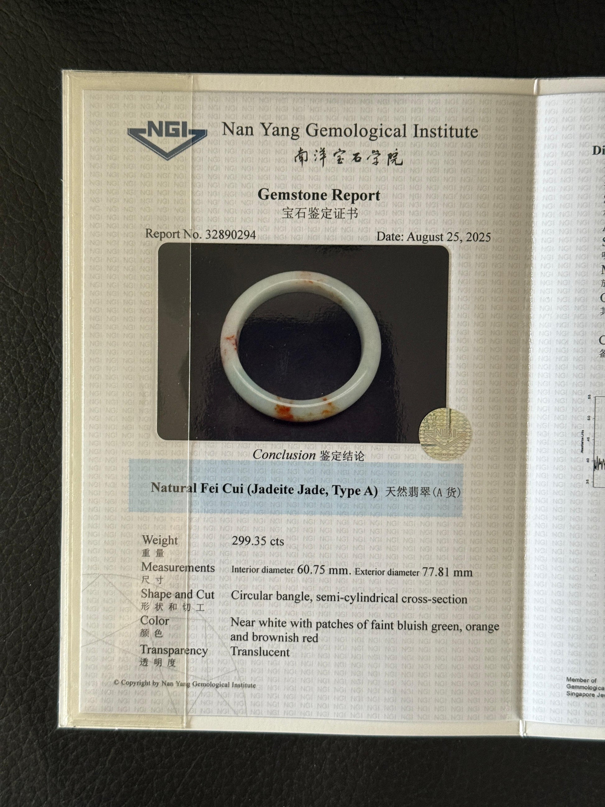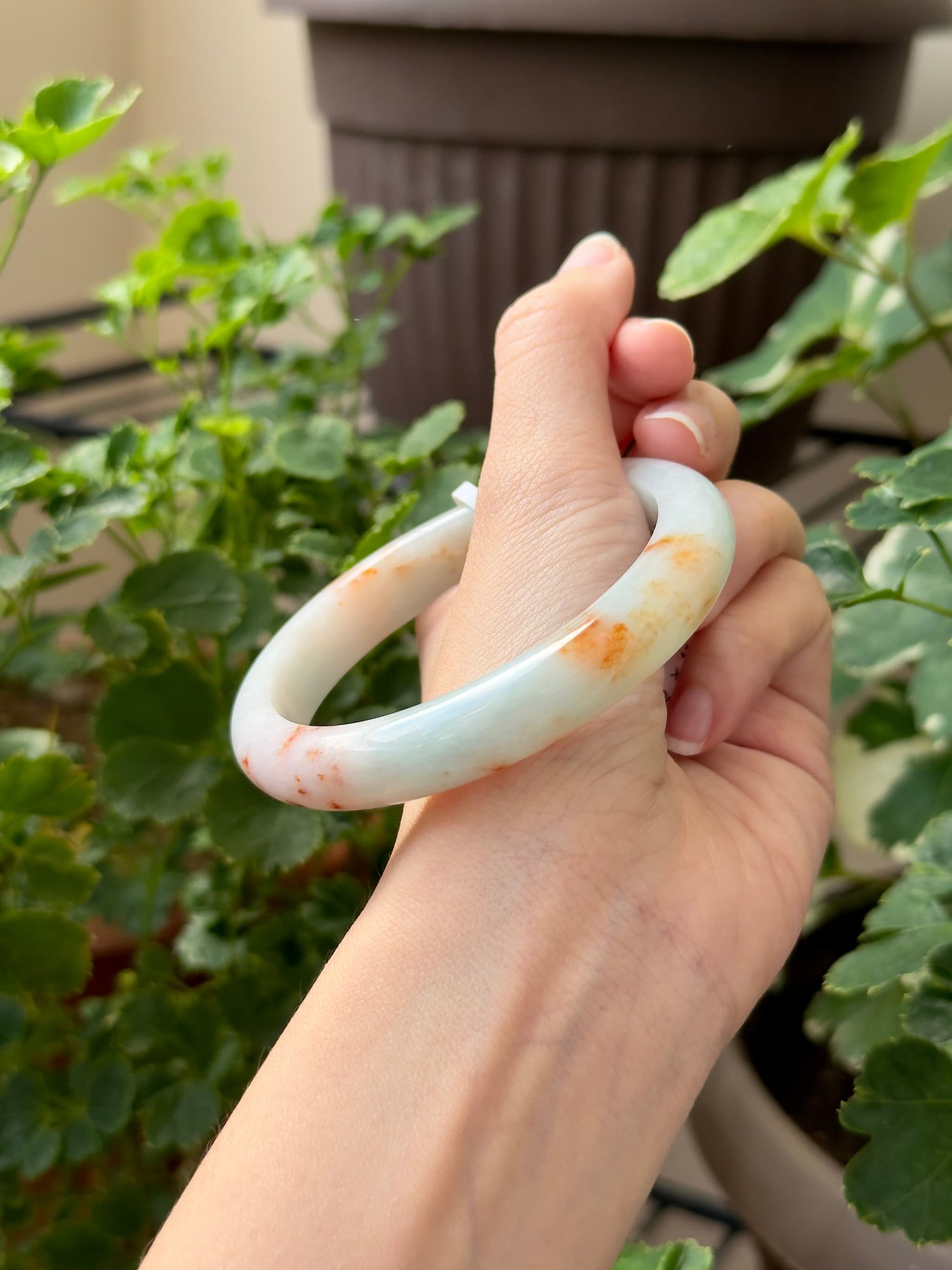 This bangle is known in the market as fulushou tricolor with three distinct colour tones on a single jadeite piece. In a smooth and glutinous translucency with good water, this piece has an even clarity throughout the stone. It is free from dirt or cotton patches. A rare and unique, larger-sized piece, perfect as a budget-friendly starter for anyone beginning her jadeite journey, with a charming twist.