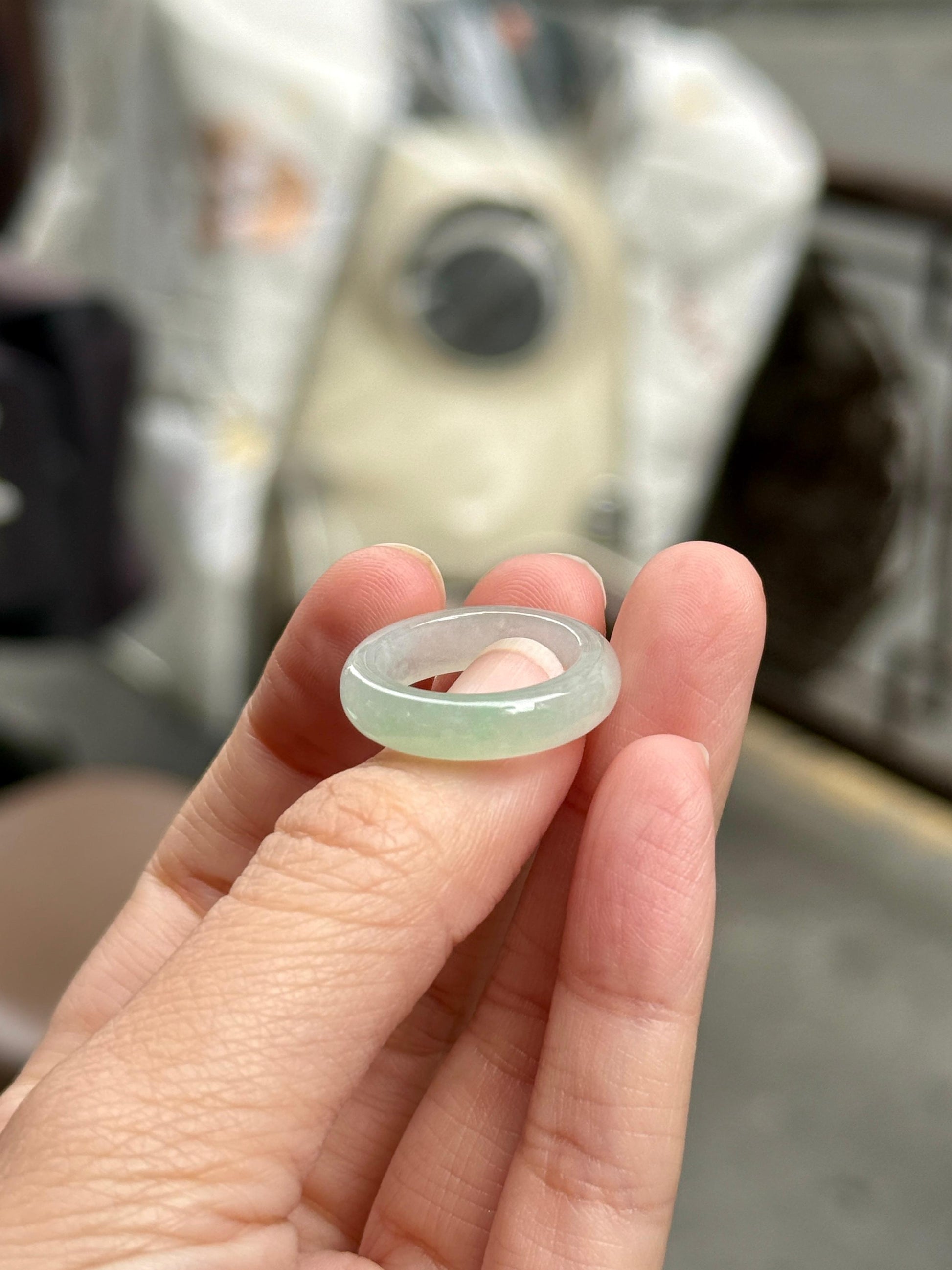 An icy jelly-liked faint green gradient jadeite ring band with refined grains and very even translucency. It was cut from a slab with very good water and good translucency and this piece is visually poreless (jelly-liked base) with no black or cotton specks. In an ultra wide and thick cut, it is a durable jadeite ring band for everyday wear.