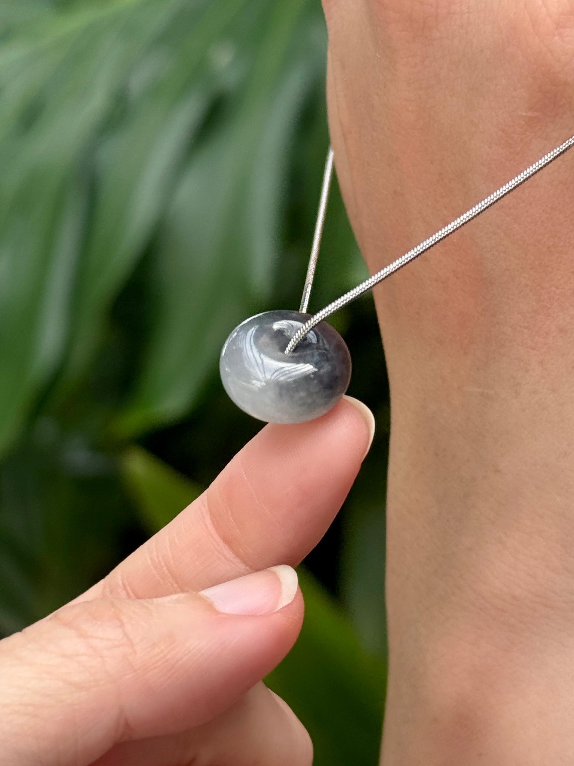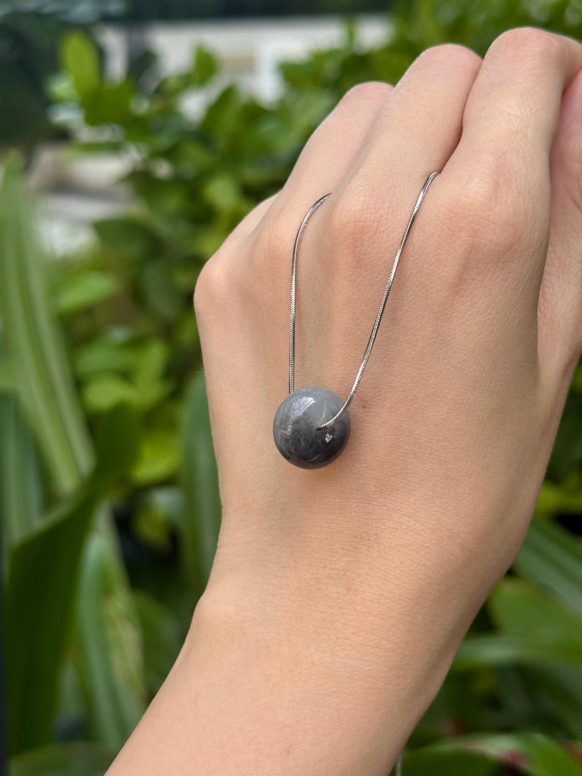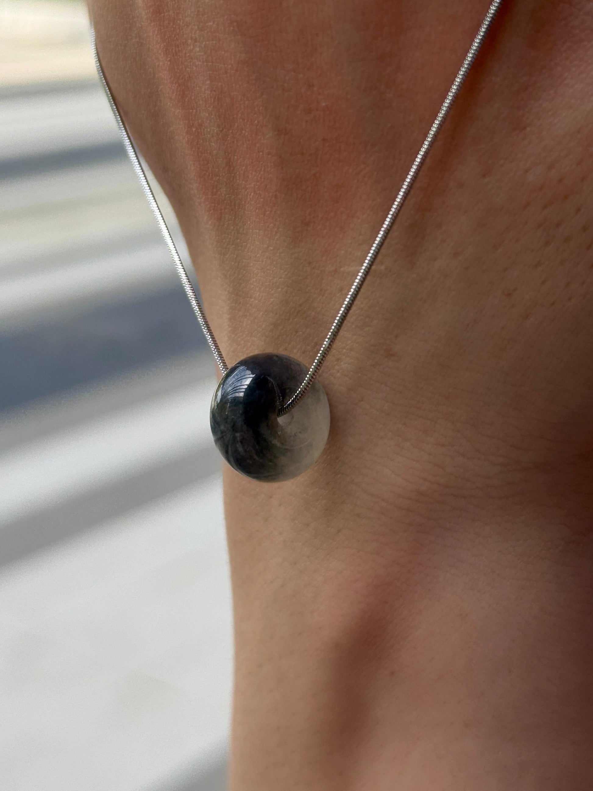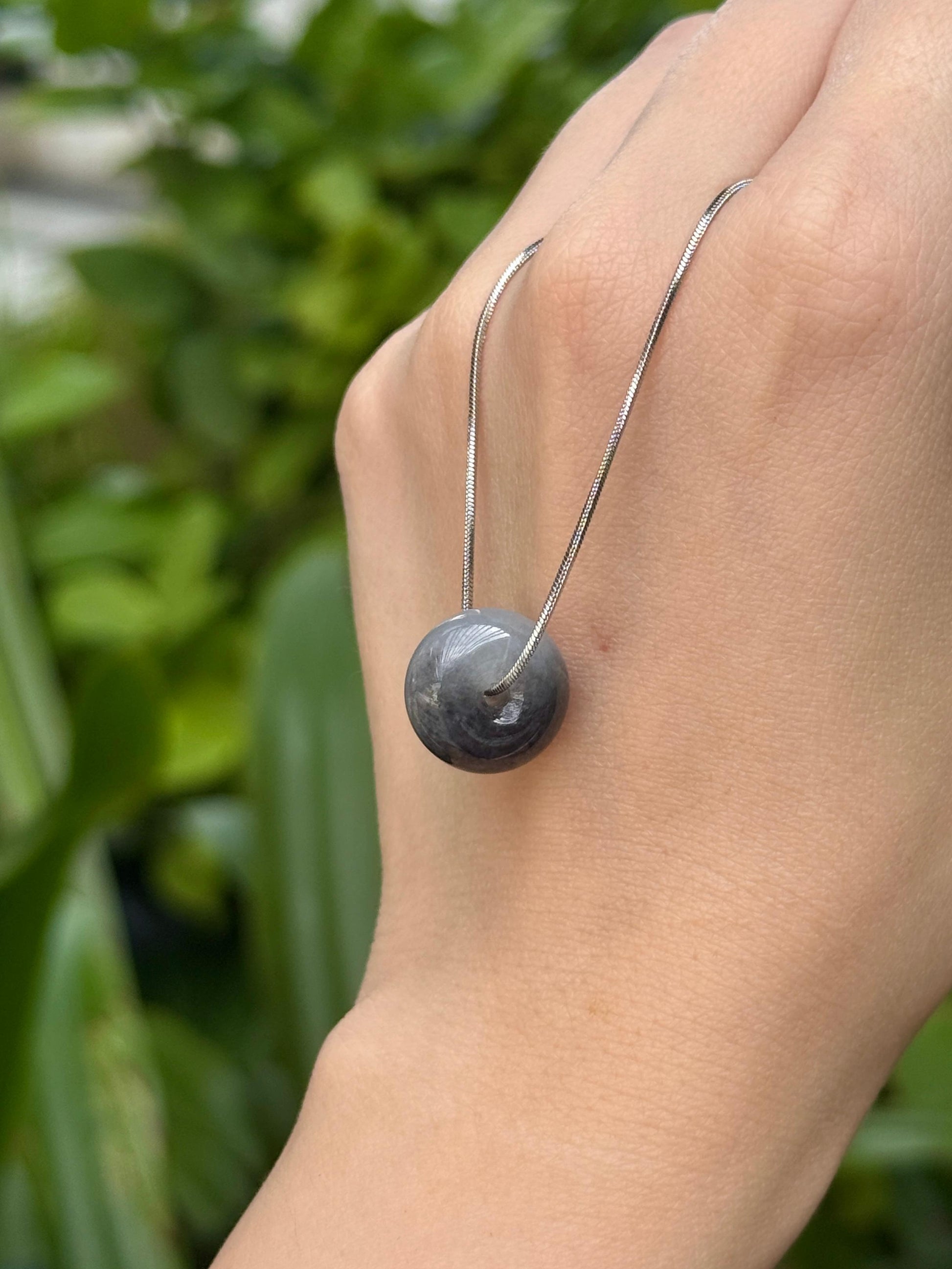 Icy-glutinous translucency half black and grey Wuji jadeite barrel pendant in a thicker cut of 8.2mm thickness. With good water, this piece appears lustrous under sunlight despite its black natural coloration. It's not the dry matte black type of quality. It is a substantial piece to wear as a pendant with a touch of edge, a perfect pairing with monochromatic outfits.