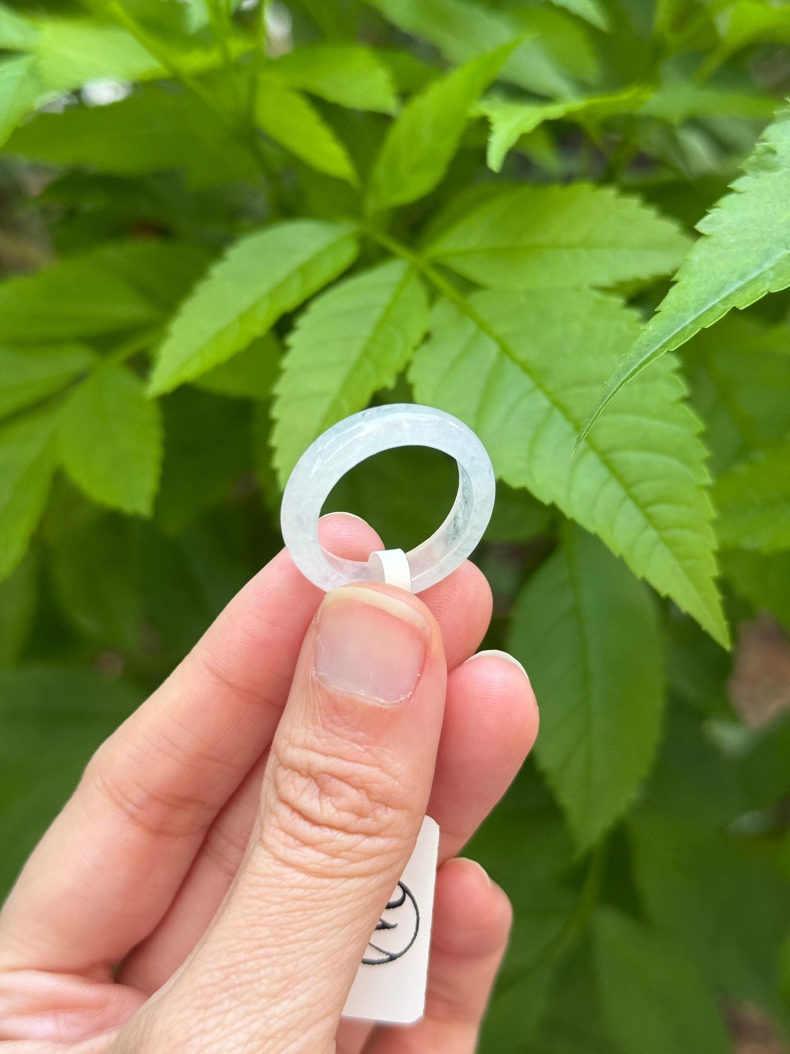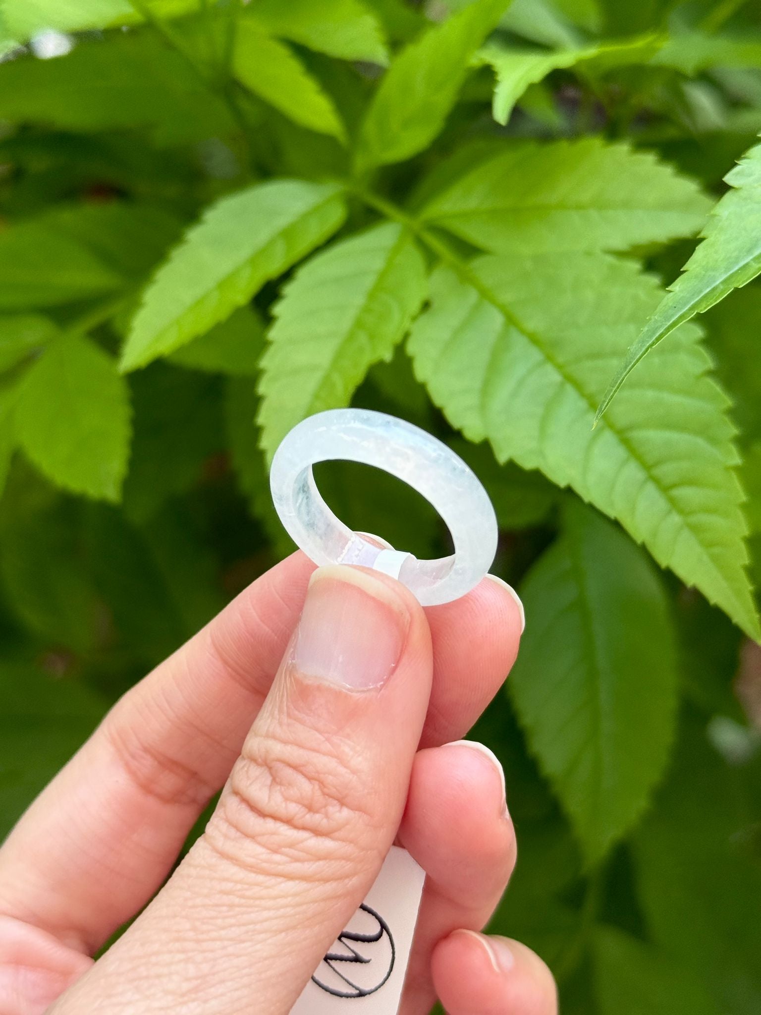 Icy-glutinous to icy translucency with refined grains. Their scattered internal cotton gave them a visually white appearance, just like the snow. Cut from a slab with very good water and very good translucency, you'd notice a soft glow against the sun. This batch is in a thicker cut above 5.3mm width and 3.5mm thickness. They are much more durable as compared to slimmer ring bands within 3.5x2.5mm.